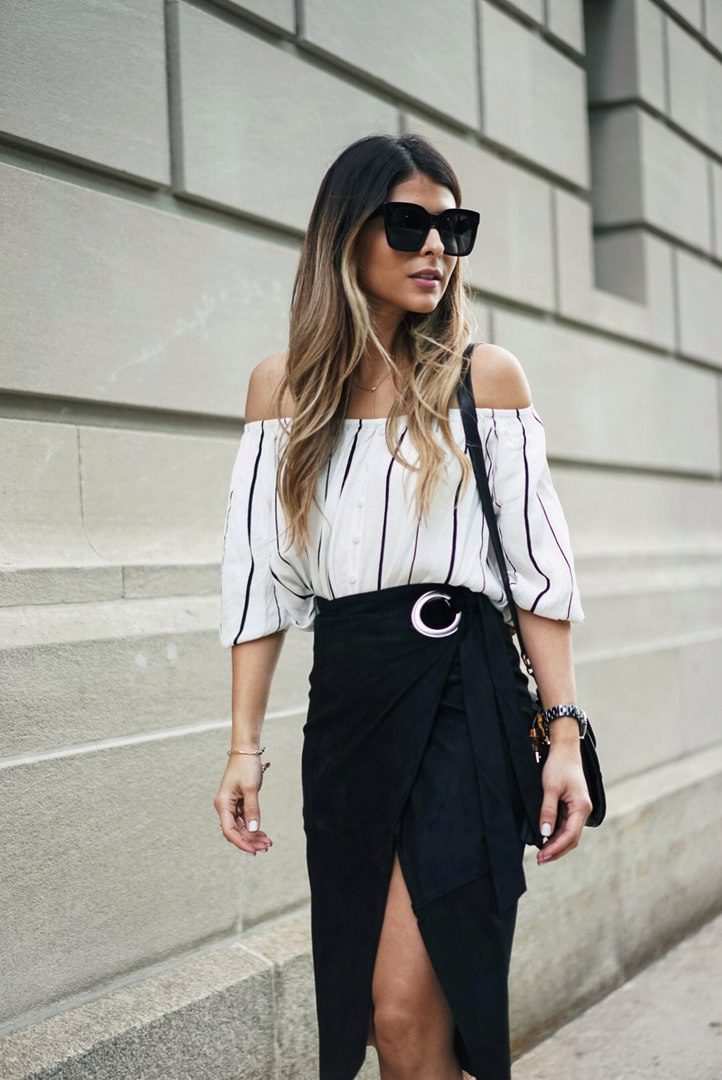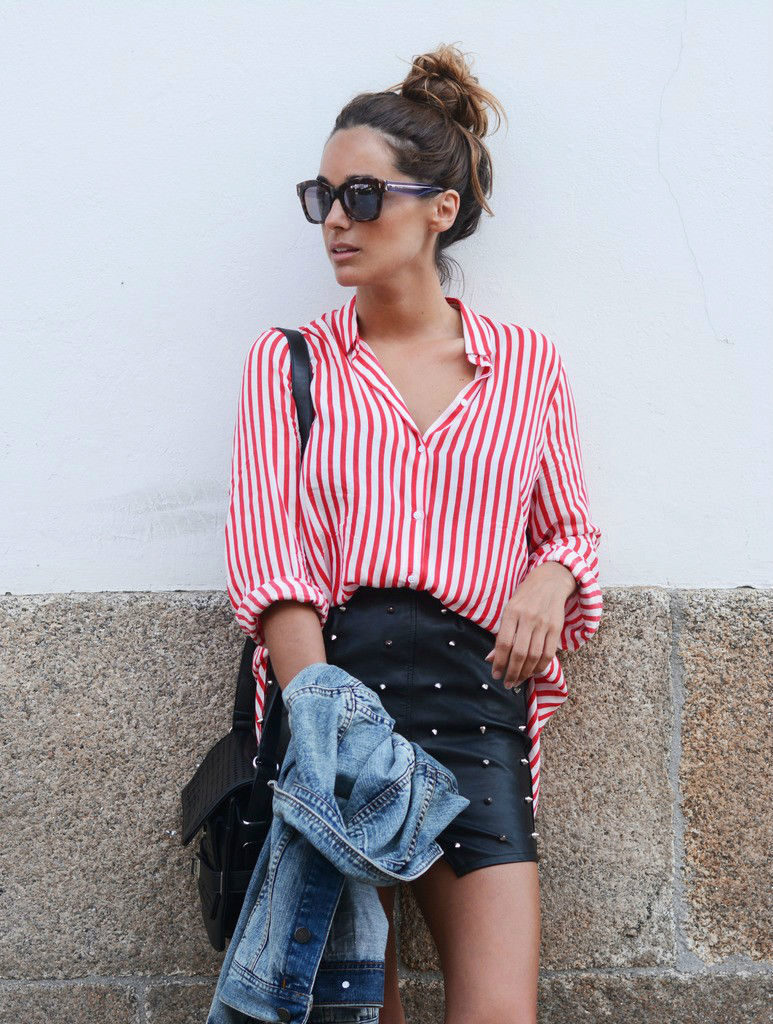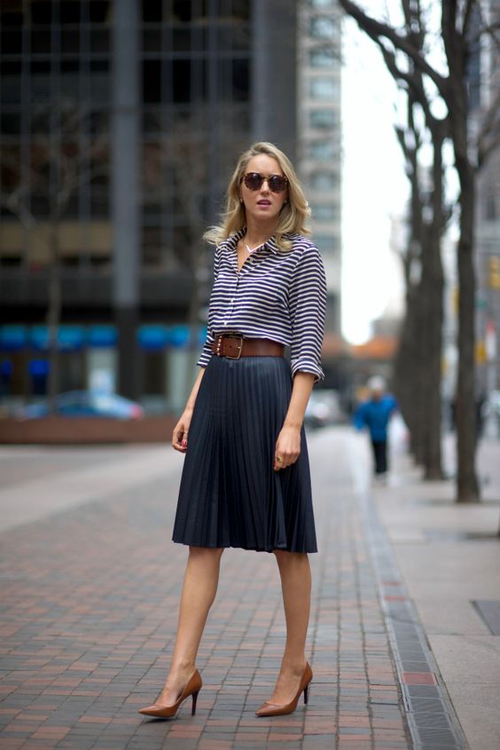 The striped shirt in a pair with a skirt looks very stylish and feminine. If you choose a denim skirt, get an interesting look for every day. A strict pencil skirt will complement the business look. And the airy skirt as well as possible will fit into the ensemble for a romantic date.