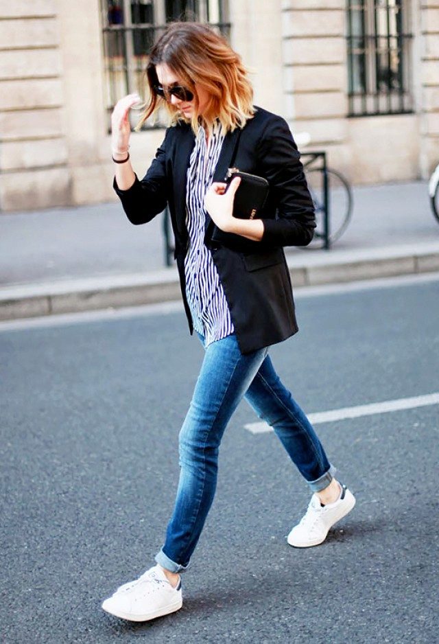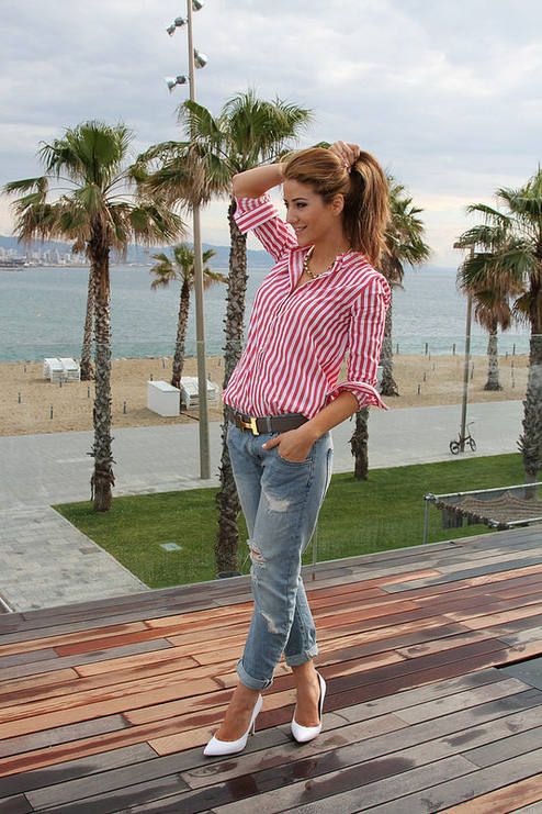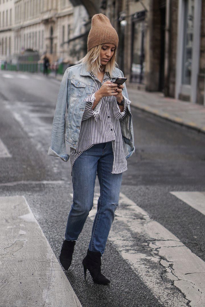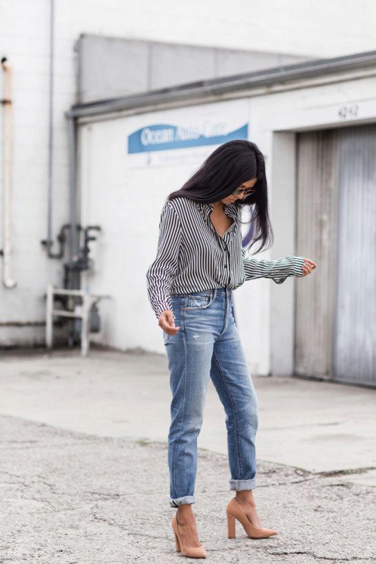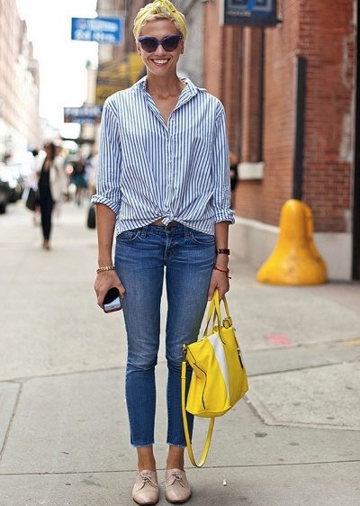 A striped shirt in combination with jeans is a win-win option. If you want to look original, stop your choice on a bright and memorable model. To make an image look stylish, it is worth carelessly tucking a shirt into jeans, possibly leaving one end hanging down.