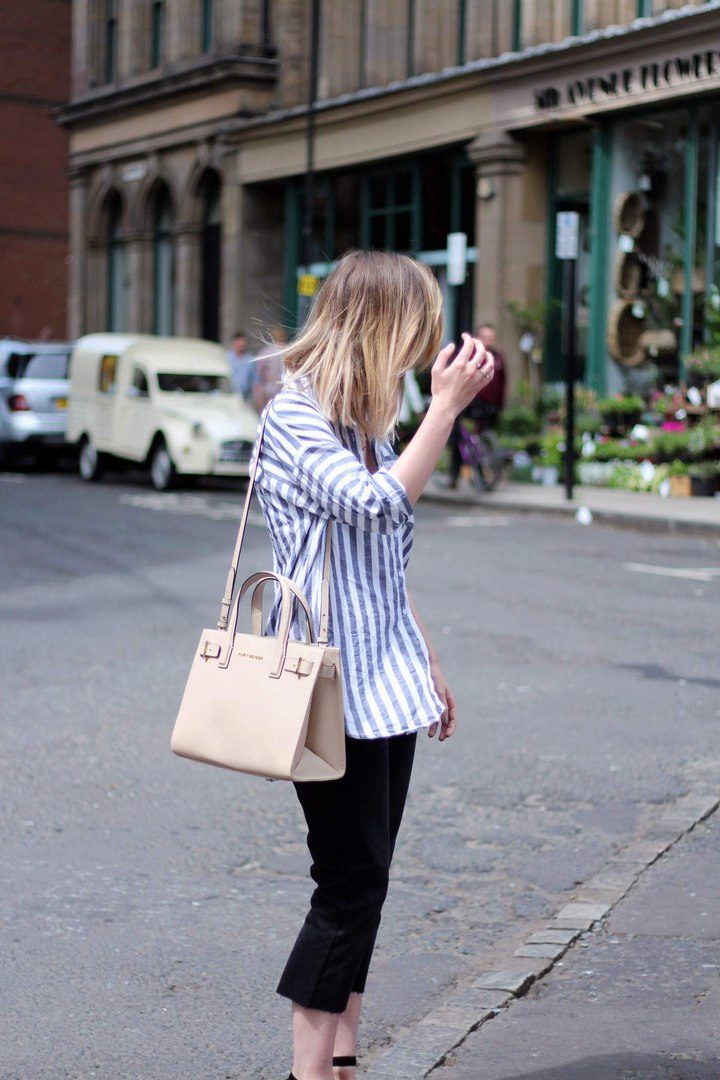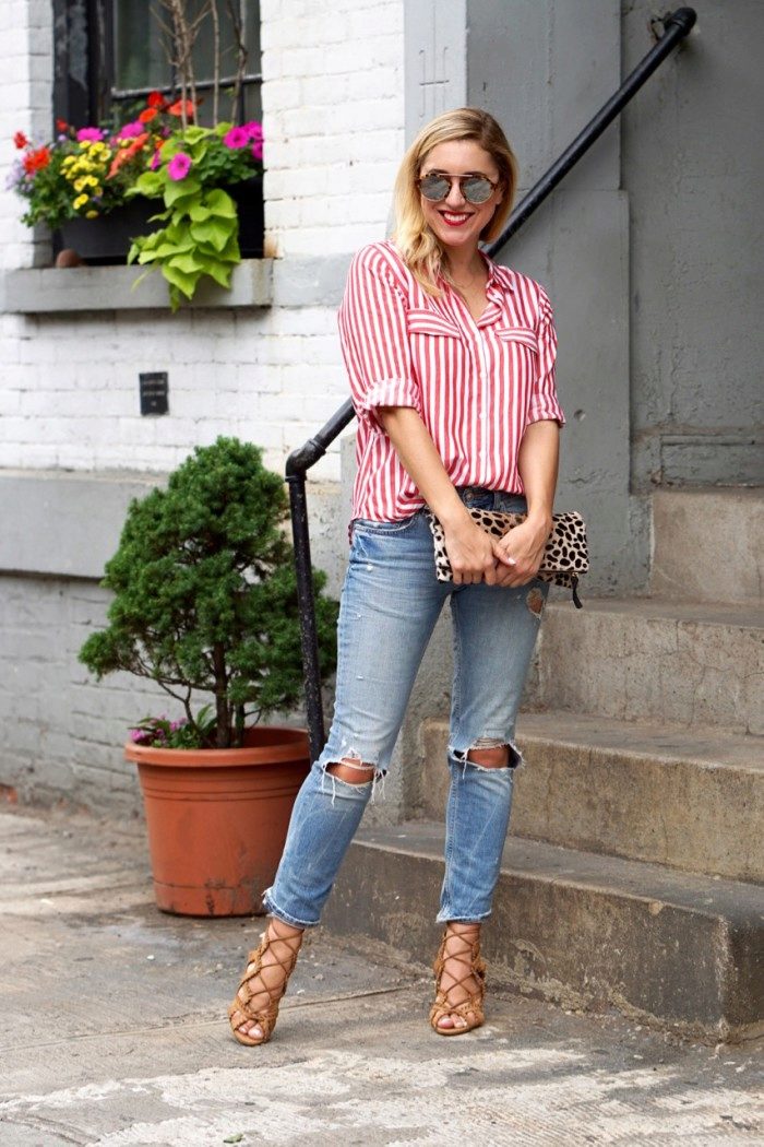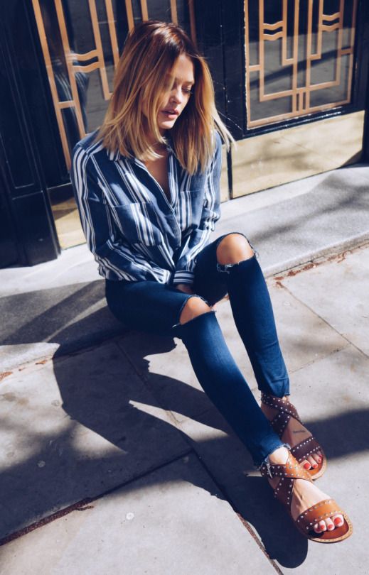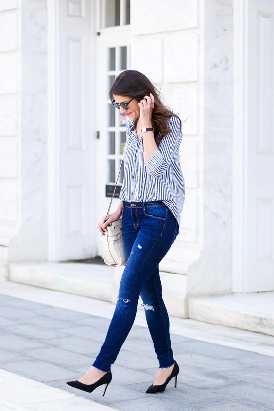 - Wonderful casual look in street style, which is suitable for a warm off-season. A striped shirt deliberately casually looks out from under a voluminous gray sweater. Ripped tabernacles make the image stylish and nontrivial. The outfit looks finished and stylish thanks to gray suede pumps, a black bulk bag and stylish sunglasses.