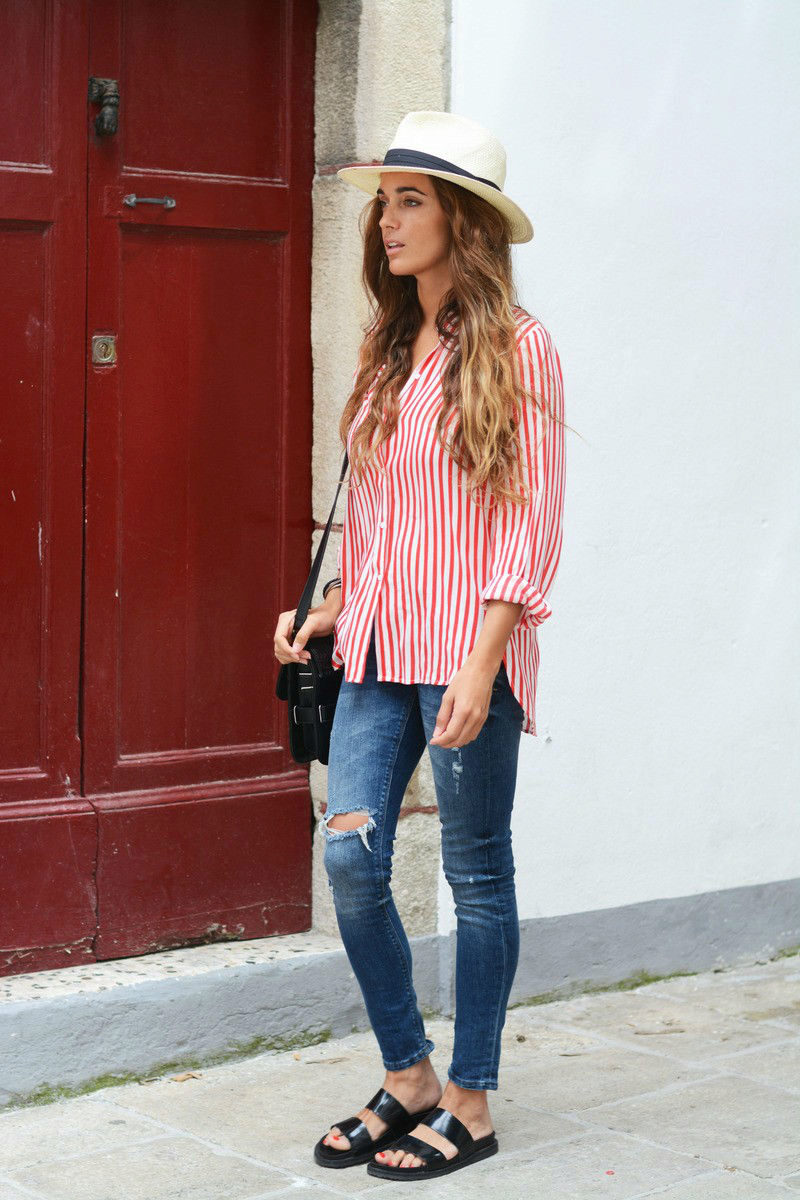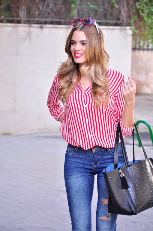 A striped red shirt blends in well with skinny jeans or skirts. This is a convenient and stylish option that is suitable for both everyday wear and for a party.