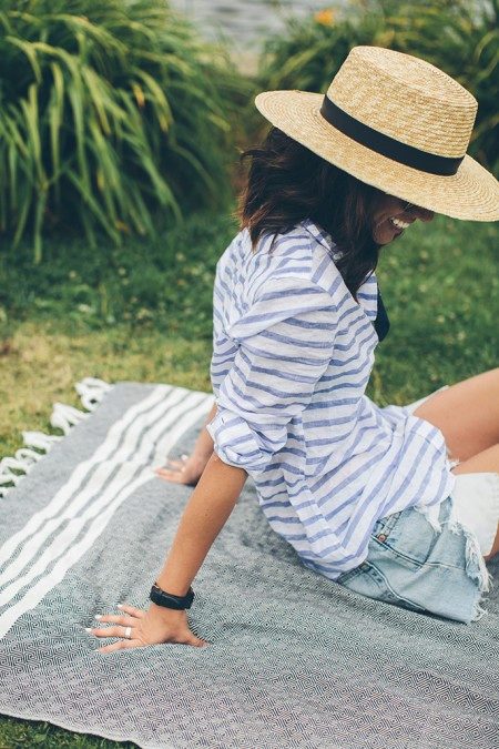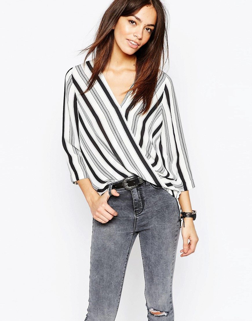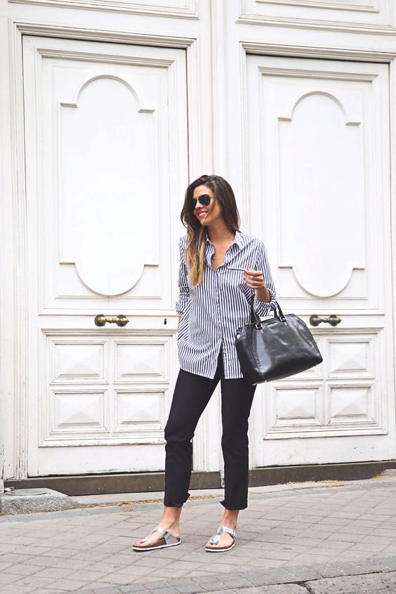 Choose a model with a horizontal strip of moderate width and wear it with a pencil skirt, shorts, jeans or cropped trousers.