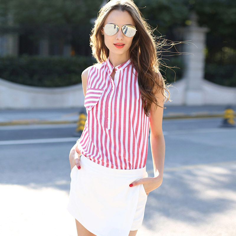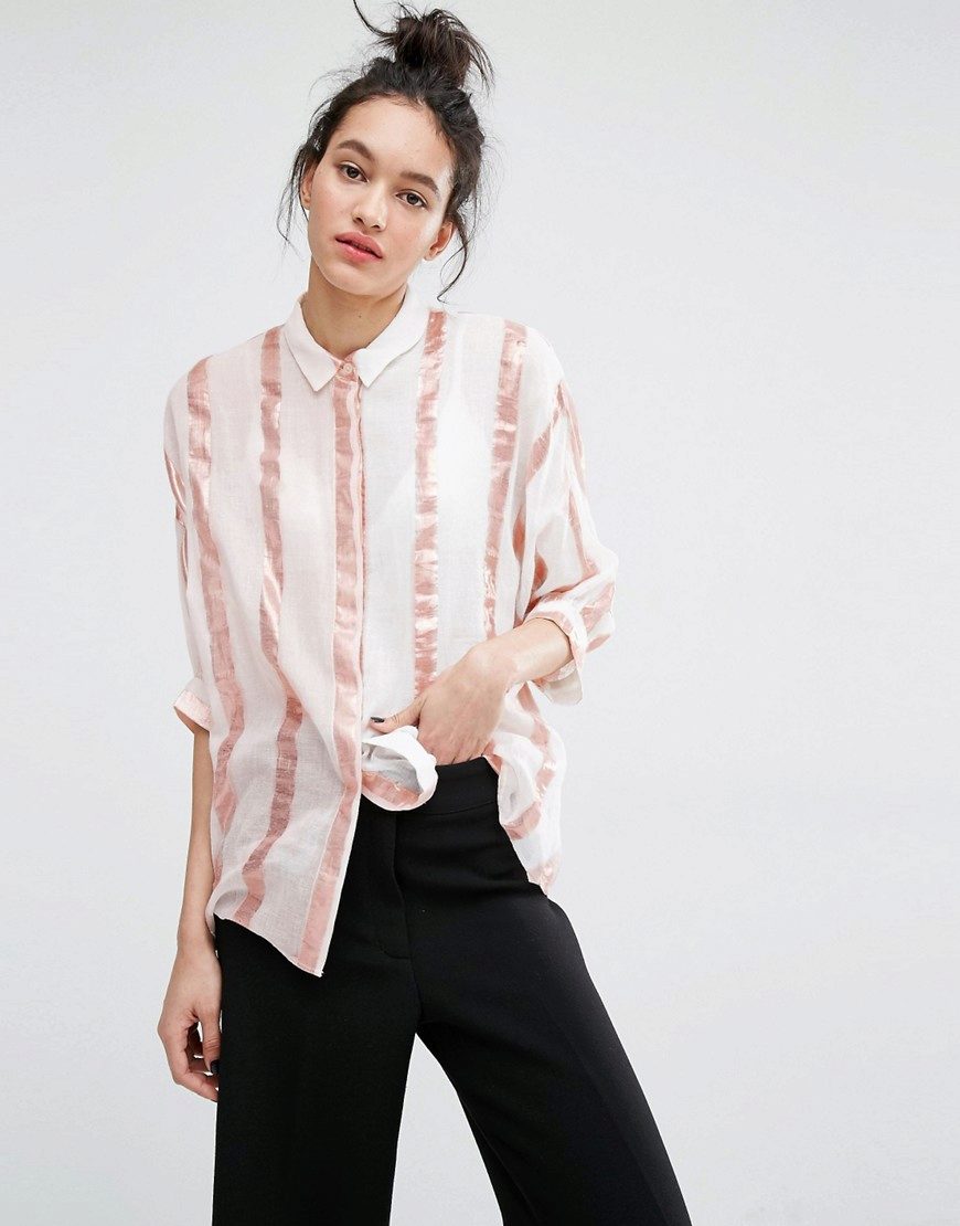 Pink striped shirt is suitable for sensual romantic images. It will go well with denim, fluffy skirts and cropped trousers.