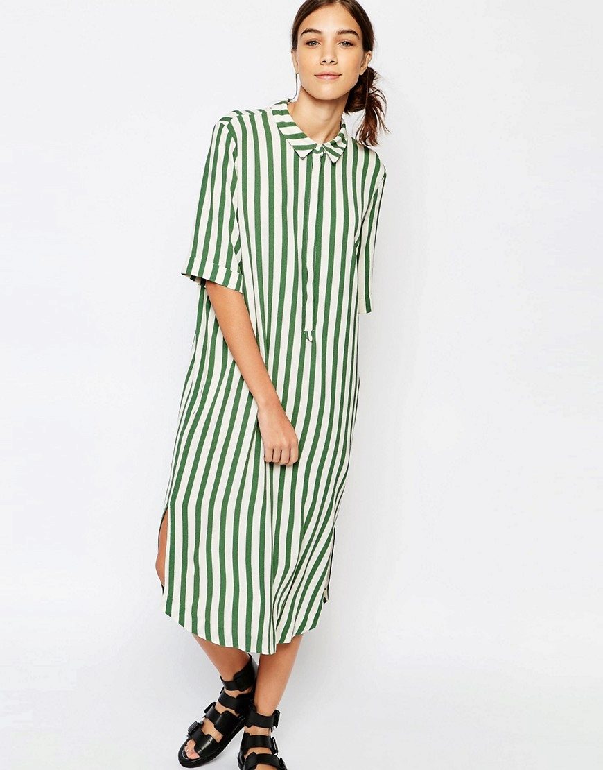 A green striped shirt is perfect for an interesting, business-like look, complemented by a boring casual outfit. The green color looks stylish and unbroken, so you should pay attention to it.