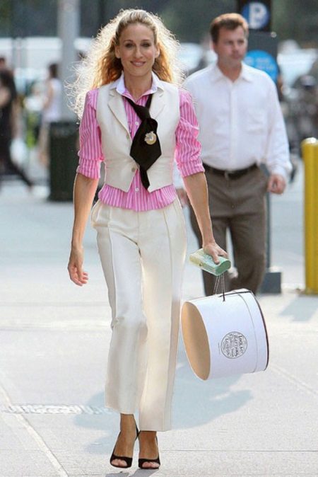 At work, you can wear a pink striped shirt with a white trouser suit, following the example of the famous Kerry Bradshaw. However, this image is suitable for a solemn occasion.