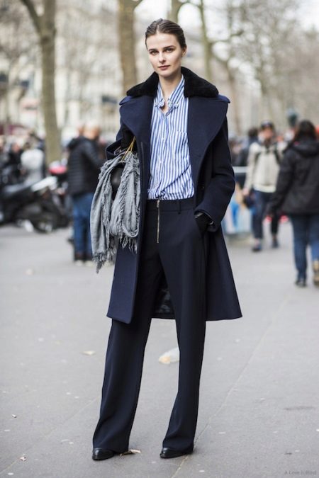 - A full-fledged business image for the winter season. Fashionable trousers for men cut, shirt in white and blue striped, dark blue knee-length coat. The image is complemented by black ankle boots with a small bag and a gray scarf. Such a strict and laconic combination makes the image brutal and masculine. What you need for a business woman with an iron grip.