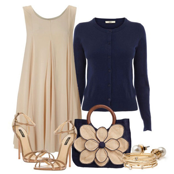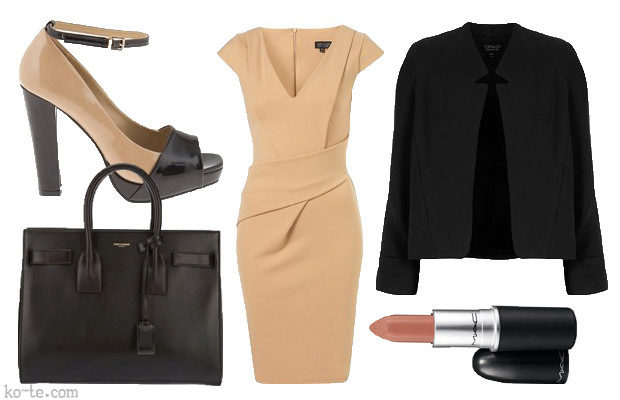 If you wear a beige dress with a fitted jacket, then it is better to choose brown shoes and a bag from the shoes. In this form, you can go to the office to work.