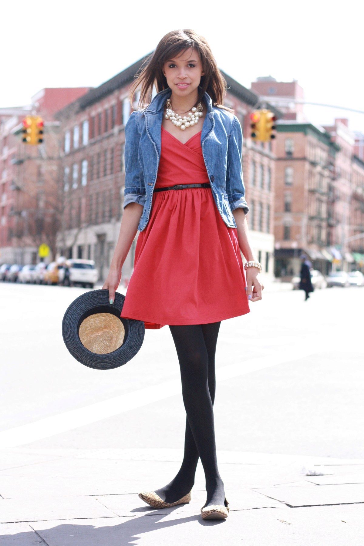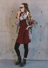 A short dress can be entered into a casual look. Complement it with a hat, hair dressing, black tights, a small bag on a long strap and sunglasses. From jewelry pick up a concise necklace and a few bracelets.