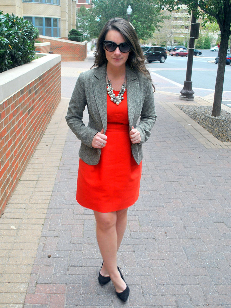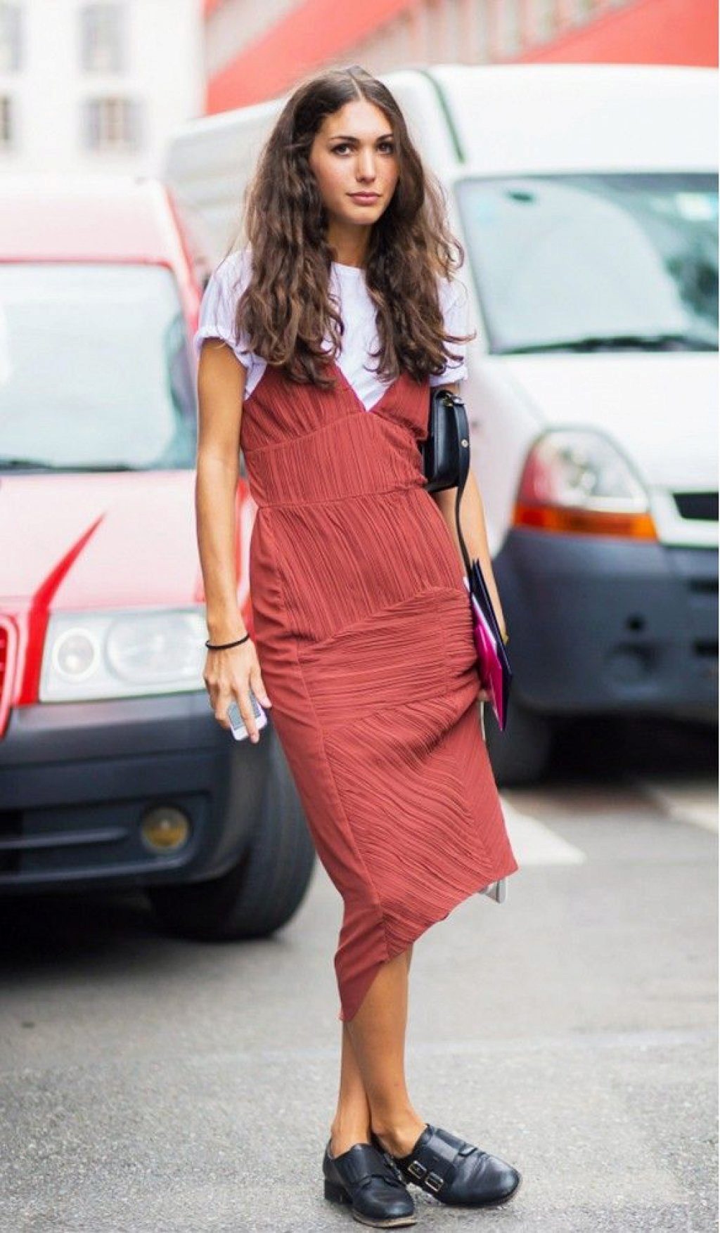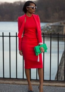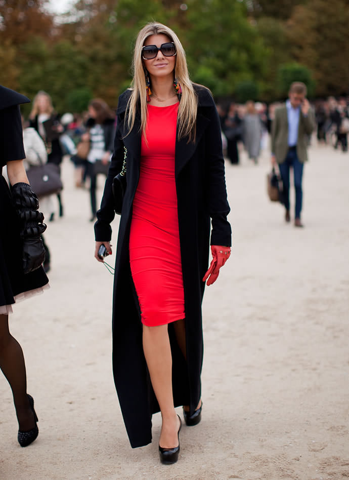 In any case, it should not be overshadowed by accessories, because the red dress is already the main part of the image. In a working atmosphere, neutral dark hues look best: black, navy, and brown.