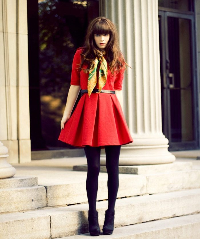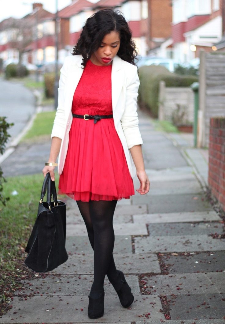 Since with the onset of autumn, red dresses will become particularly relevant, they will certainly have to pick up tights. They must be solid, transparent or black. For every day, tight tights or even leggings will do, and thin stockings will be appropriate for publication.
