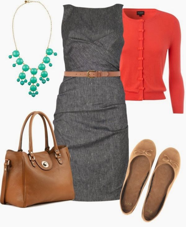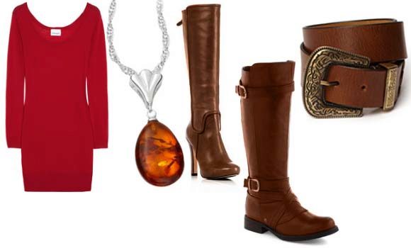 Brown boots and a belt are great companions for a red straight dress. Complement the ensemble jewelry with jasper, amber or tiger eye.