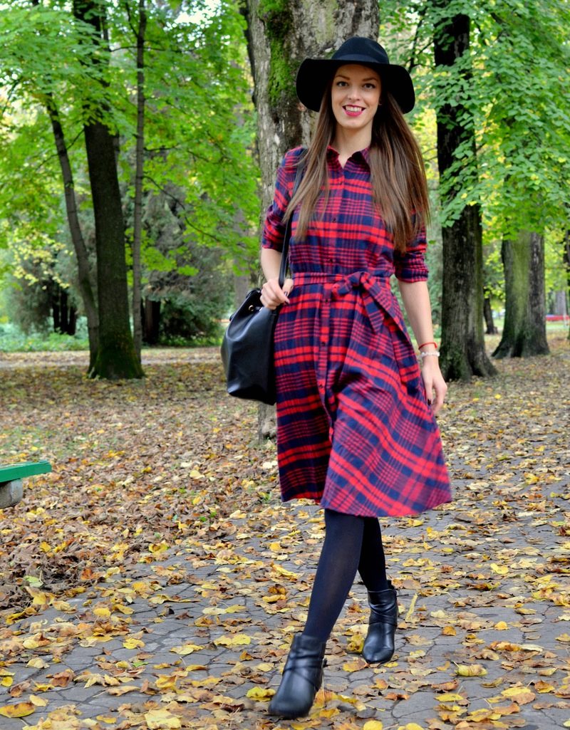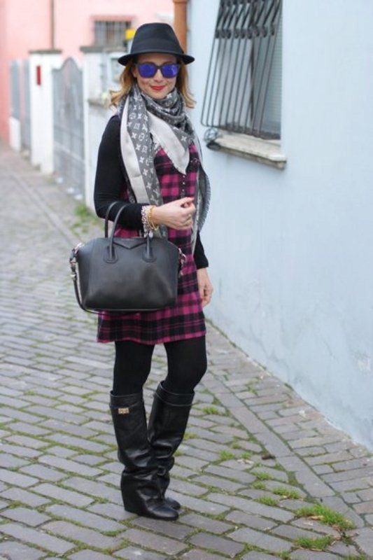 In a cool season, it is better to wear a leather jacket or a short denim jacket to the top. The image in a plaid dress will be ideal for lovers of the so-called "street" style.