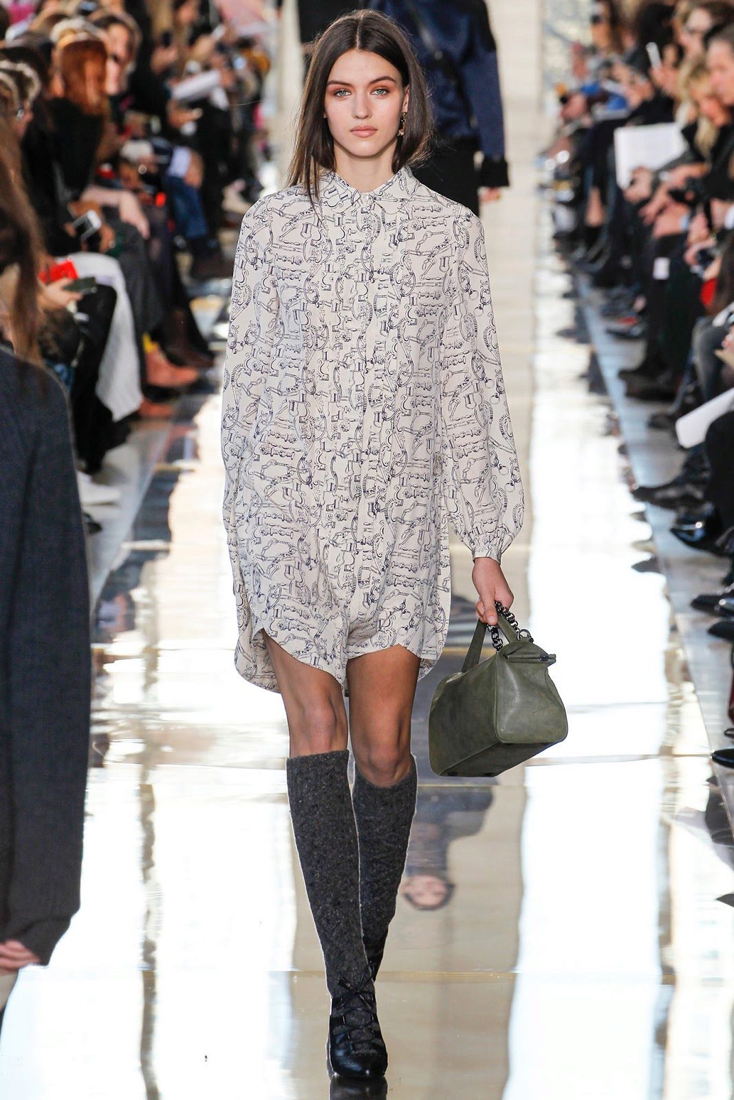 A cropped cashmere coat will be a great choice for a warm shirt dress. This image can be supplemented with a classic bag.