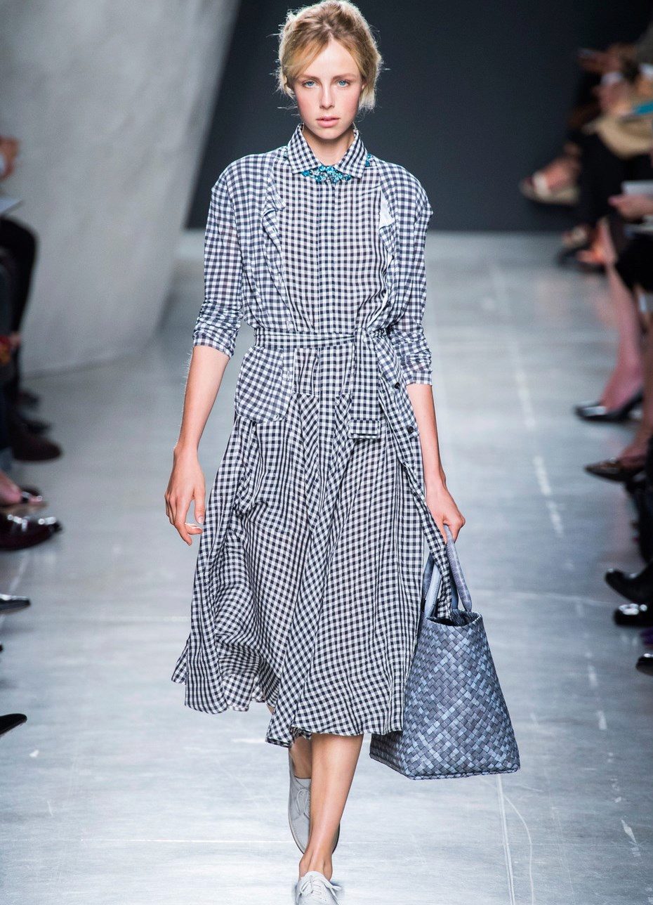 Leather accessories, such as a thin leather strap and a small leather handbag on a Chanel-style chain, are perfect for a checkered dress. It can be worn with narrow jeans or leather trousers.