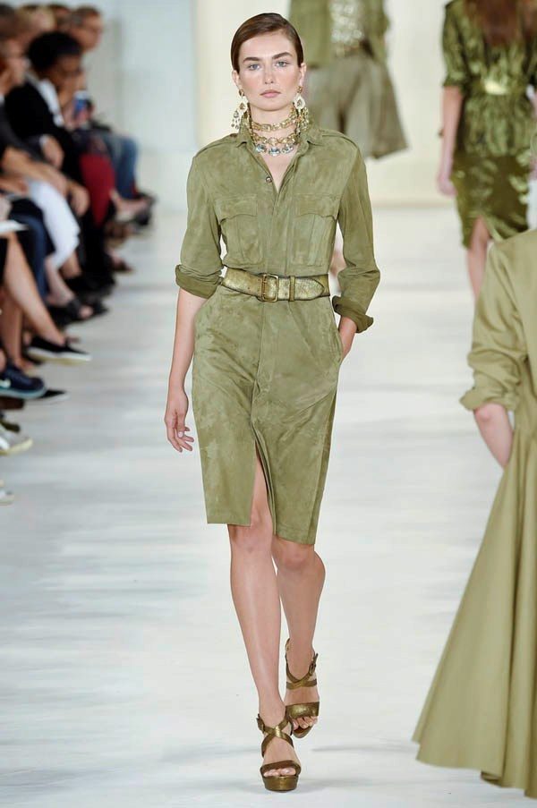 The shirt-dress in brown, gray-green and brown-green shades in military style is maintained in the same style with the help of rough heavy boots, leather belts and bracelets. Over the dress it is better to choose a dark denim vest or jacket.