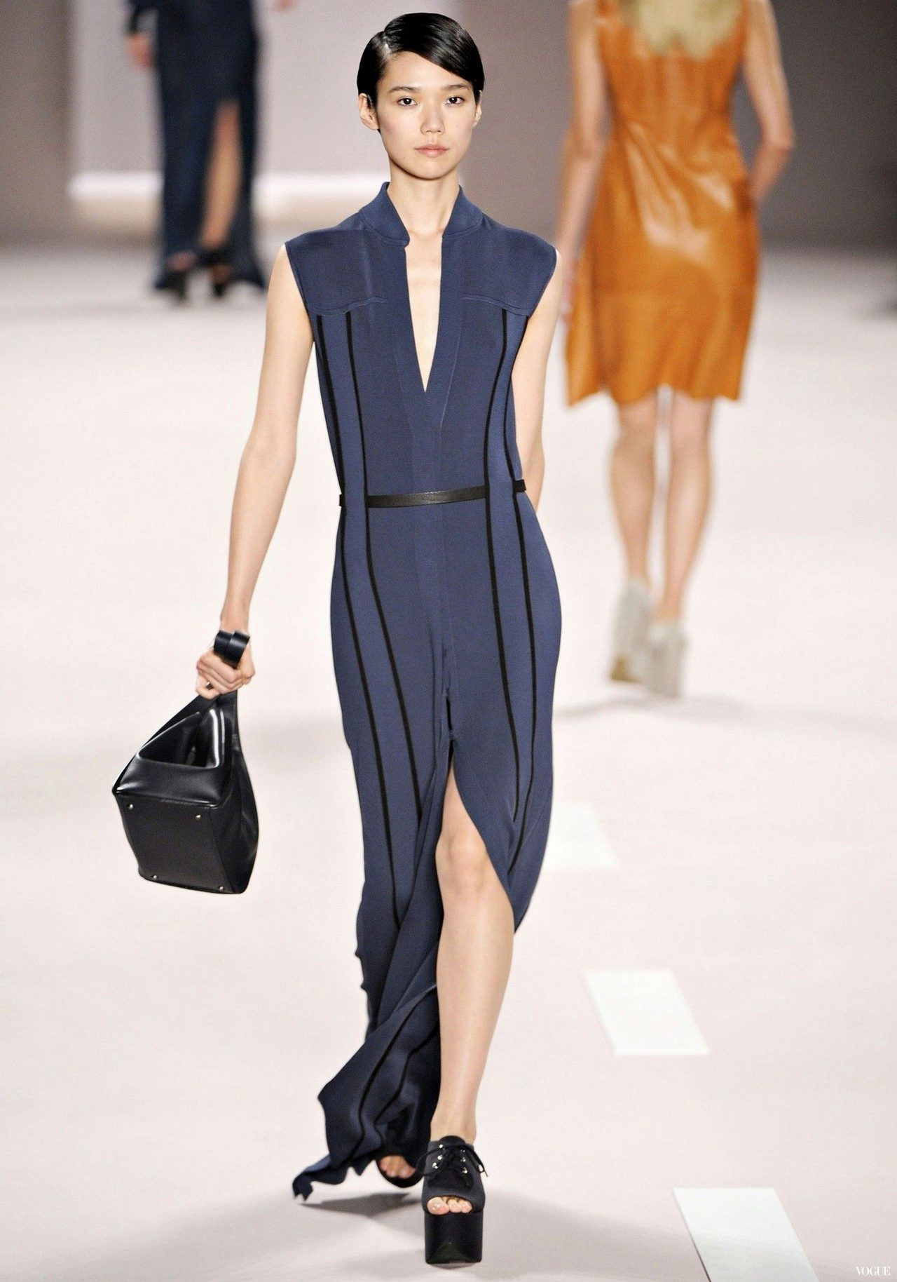 Want a perfect image - combine a dark blue dress with a white jacket, belt and other accessories.