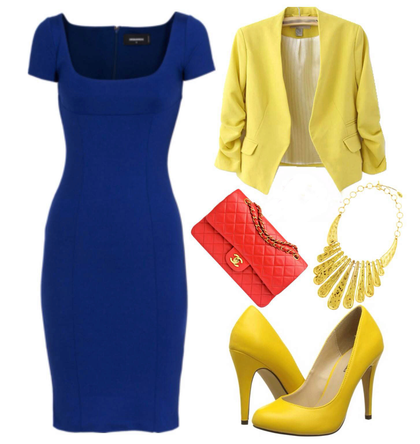 The outfit will look great with white or blue accessories.