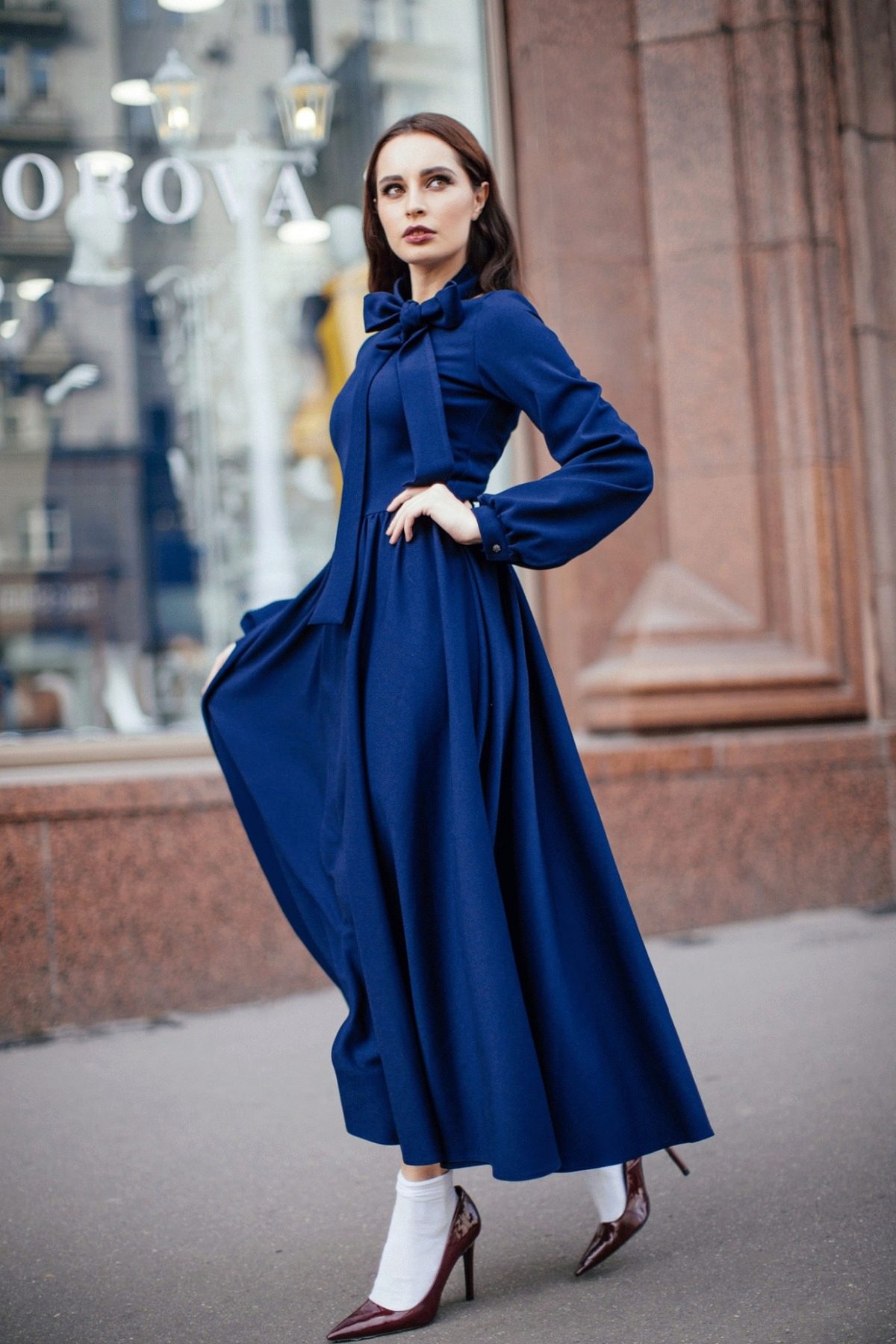 If the weather conditions do not allow you to show your tan, and the calendar is still not summer, then we advise you to choose matte tights for your blue dress. It can be black, bodily, blue and even white. You can also combine a dress with tights of cappuccino or burgundy.