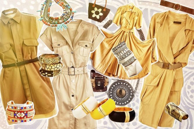 Under the dress in safari style, it is better to choose sandals, the color of which will ideally be combined with a hint of a belt. The sole of the sandal must be flat or on the wedge so that you can go for a long walk.