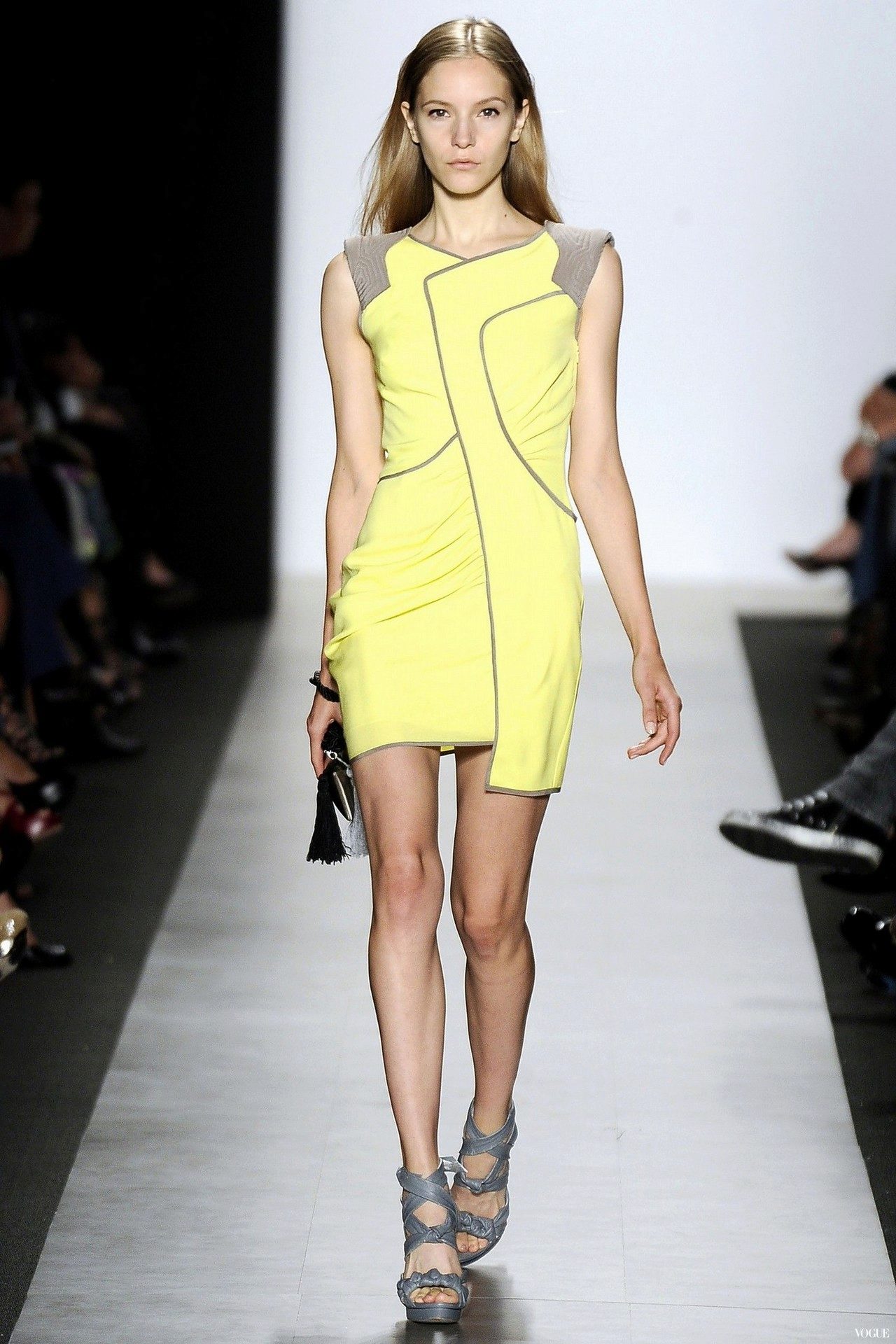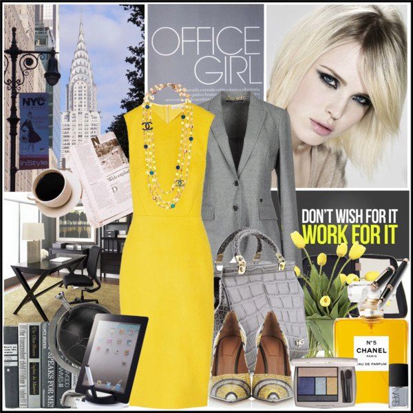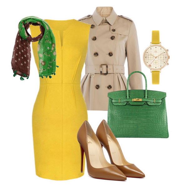 Brightness of yellow will be muffled by light gray and pearl accessories. A fine accent will be a leather woven belt, it will add elegance to the whole image.