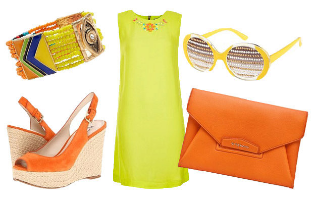 In the daytime, you can experiment with blue sandals and large jewelry, green clutch and shoes.