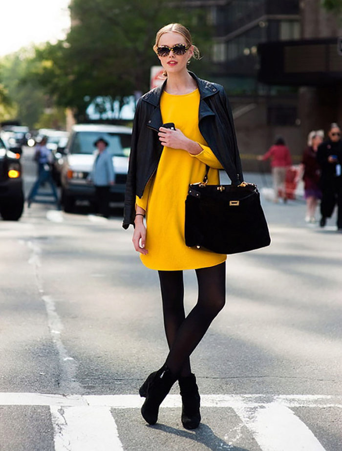 With the choice of tights should be careful. Pantyhose for skin tone or pantyhose for one / two tones darker would be an ideal option for a yellow shade dress.Gray tights can be combined with lemon color attire. Carefully thought out image will allow you to wear black tights that will look great with a yellow dress.