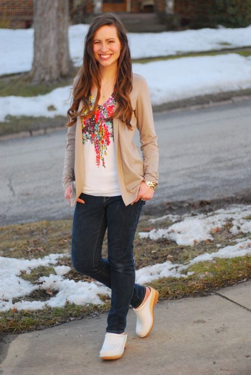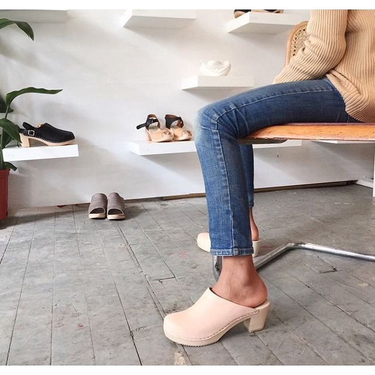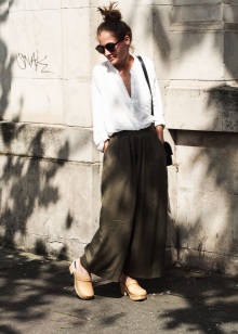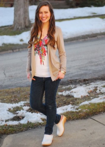 - Trousers of various styles perfectly harmonize with the clogs. Fit and skinny jeans, and flared model. If the color of the pants and shoes match, the legs will look more slim.