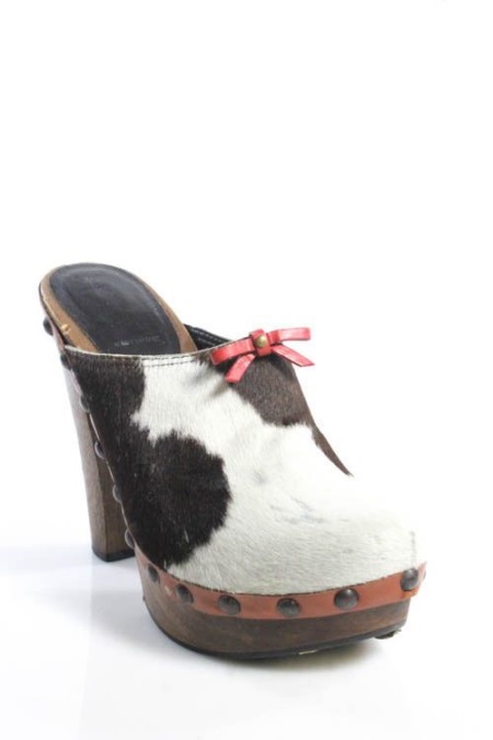 Clogs are made from a solid part of the tree so that the wedge should be inseparable from the base of the model. Most often the shoes are framed in black or brown colors, but this is just a classic variation. For lovers of outrageous images there is a great variety of products, saturated with bright colors and decorative inserts - starting with metal rivets and ending with bows.