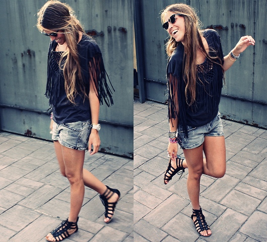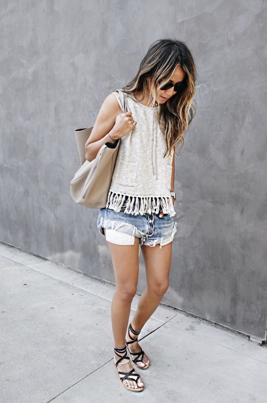 They are well combined with denim. It can be both jeans and shorts or skirts. Upstairs, it is better to wear short, free-cut tops, sporty jerseys, airy tunics decorated with fringe, or shirts. From accessories fit various ethnic jewelry (allowed a large number). Do not overload the image with massive bags. It is better to make a choice in favor of small bags over the shoulder.