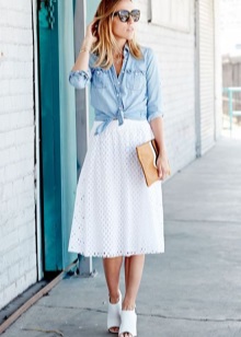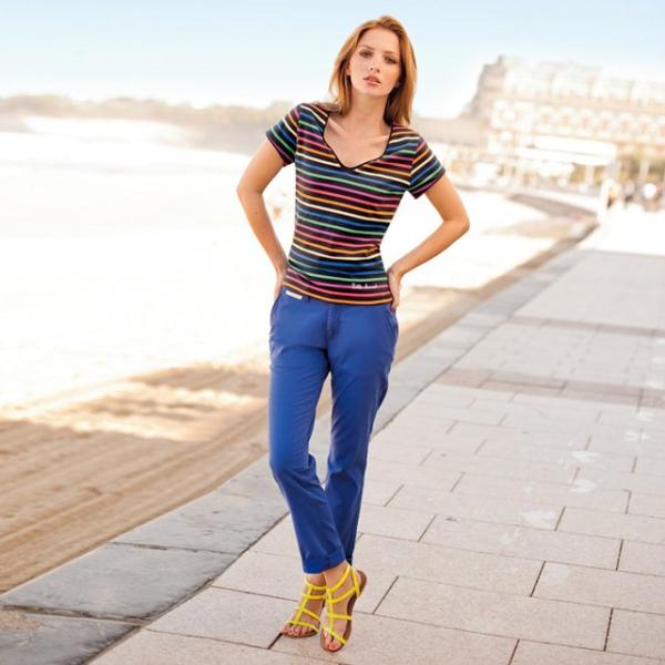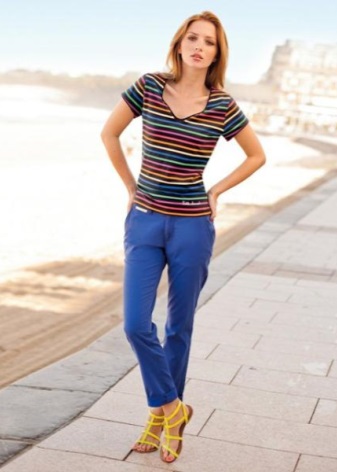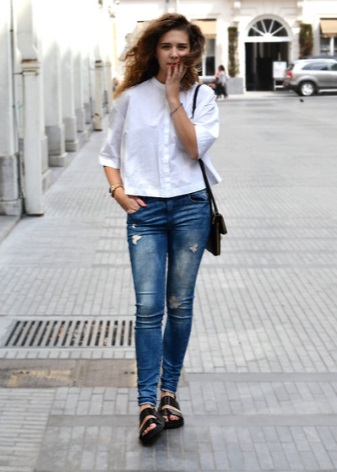 Today in fashion jeans with holes and scuffs, which means that in the summer they will not be hot. Since they are the most democratic clothes, you can pick up sandals of absolutely any style. Complement the image of a T-shirt, shirt, shirt, top, over which you can throw a kimono, cardigan, jacket or blazer.