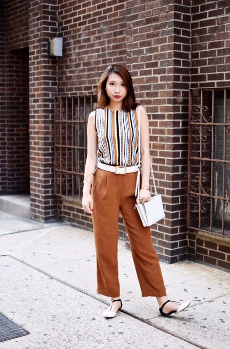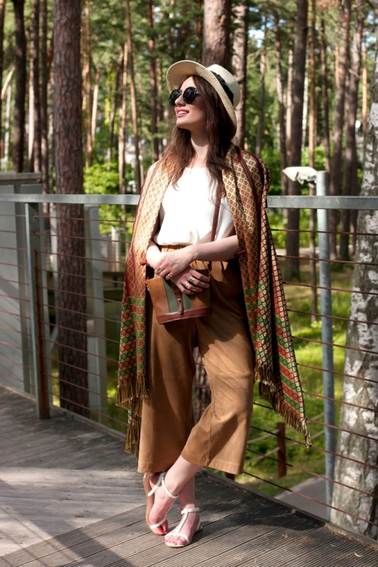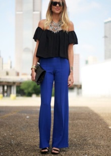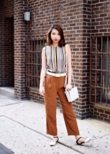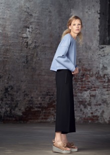 In the summer, you should give preference to loose spacious pants, in which you definitely will not be hot. They will look great with sandals on flat or thick soles. A light blouse or a T-shirt will complement the look, you can also throw a chiffon kimono on top, which is now incredibly relevant.