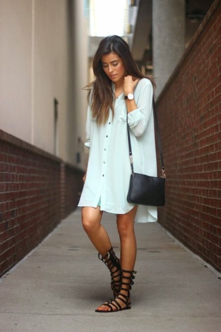 Perfect summer look. Wear a light oversize shirt dress with black gladiator sandals to complement the look with a crossbody bag and a wristwatch. You will feel confident and comfortable.