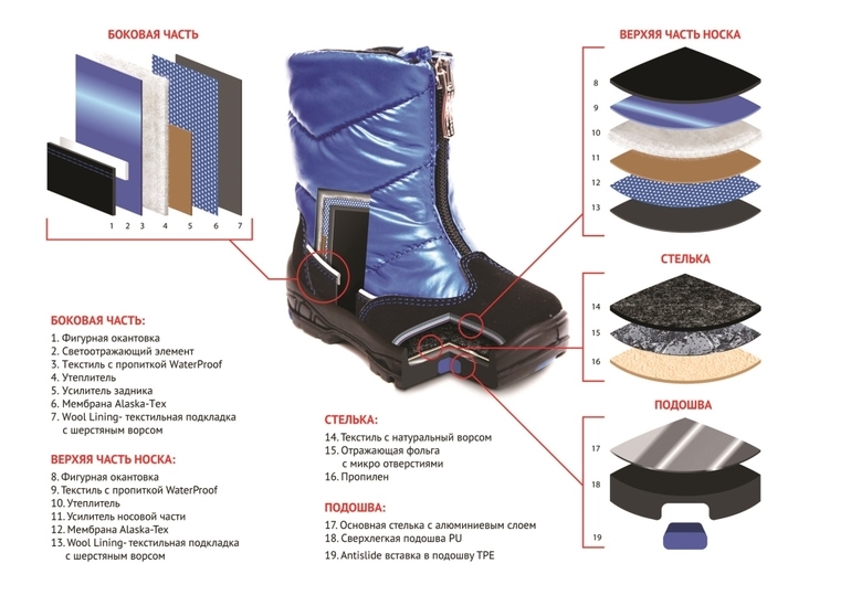 Alaska-tex membrane – plays a crucial role in creating shoes. It is an elastic and high-strength oilcloth, which is embedded in the fabric, does not let water through and allows air to circulate freely. Membrane fabrics have become very popular, at the expense of them there are practical products for slushy and not snowless winters.