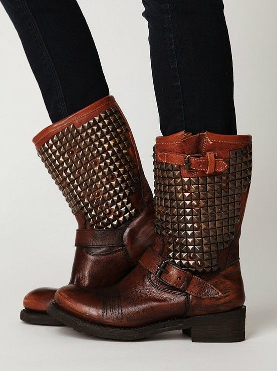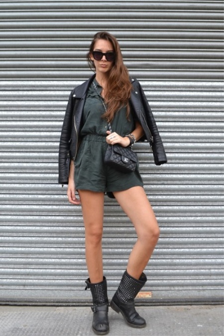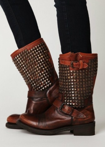 - Boots with rivets complement the outfit in casual style, consisting of a protective color overalls and a jacket-kohukhi.