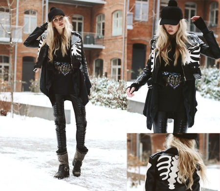 - Short denim shorts, black classic jacket, snow-white shirt go well with a black bag, decorated with chains, and a pair of Ash with rivets.