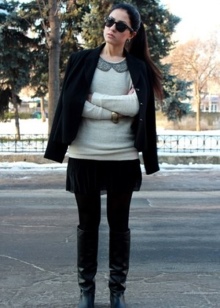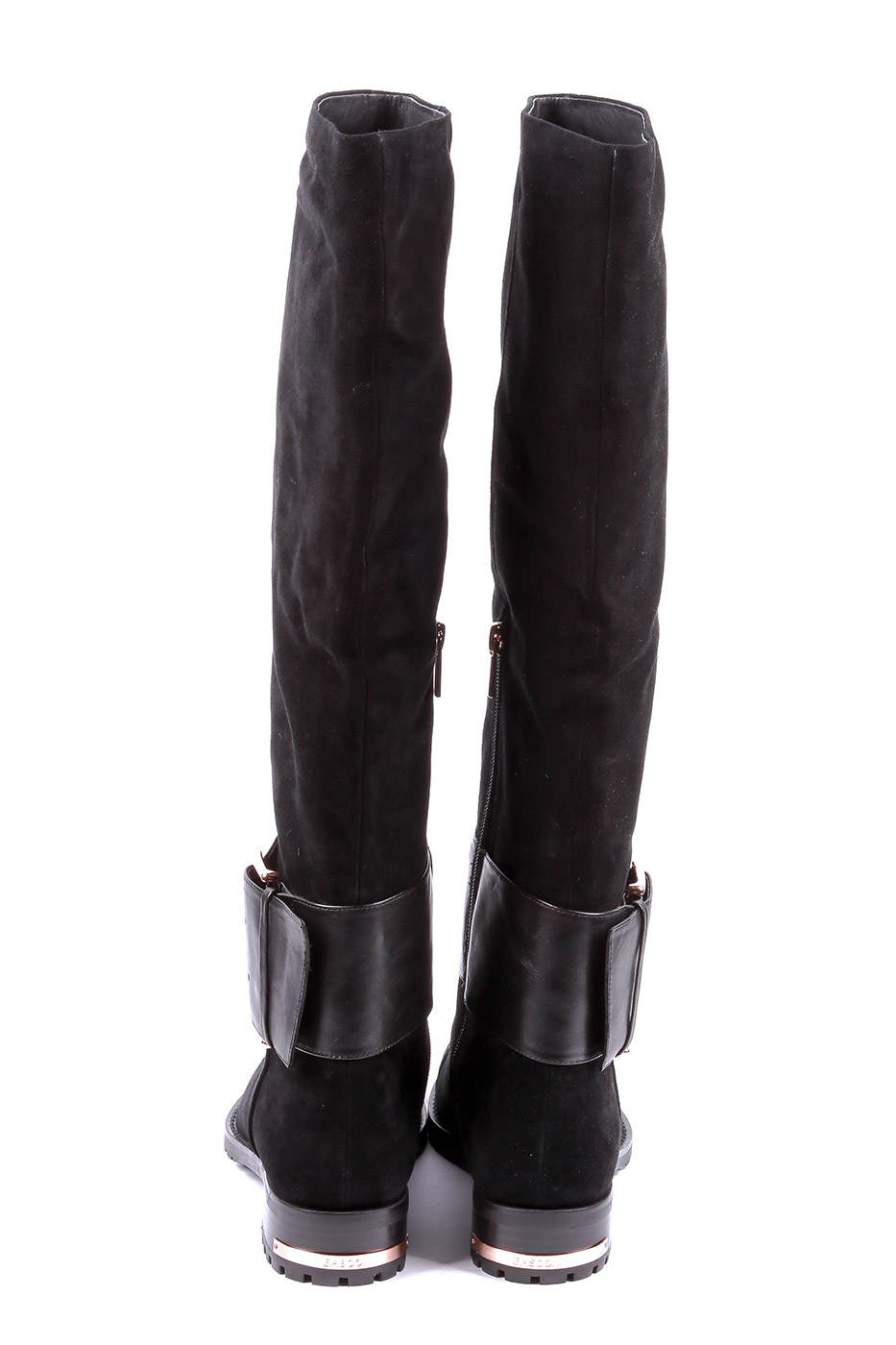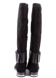 The combined boots made of leather and suede look original. The combination of different textures and shades gives the style originality.A practical black bottom with a flat sole and a small wide heel has a gray suede tops, on top of which runs a decorative belt with a metal buckle. Thanks to the optimum thickness of the sole and a small tractor relief, the boots will be stable in the ice.