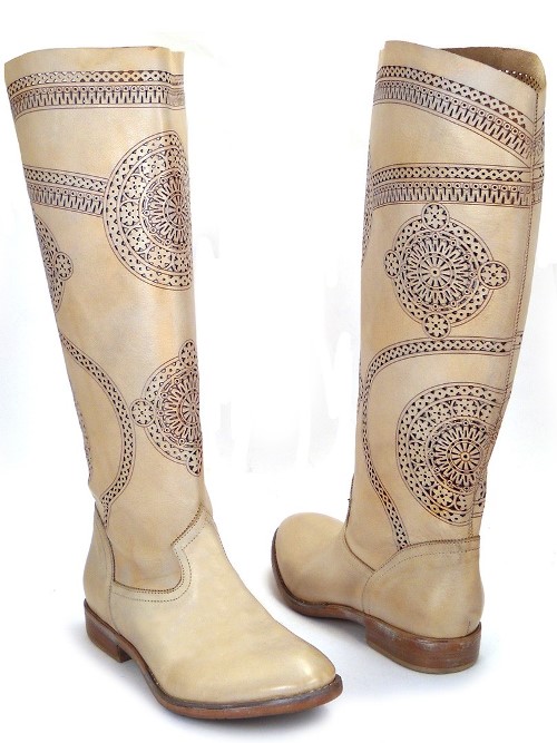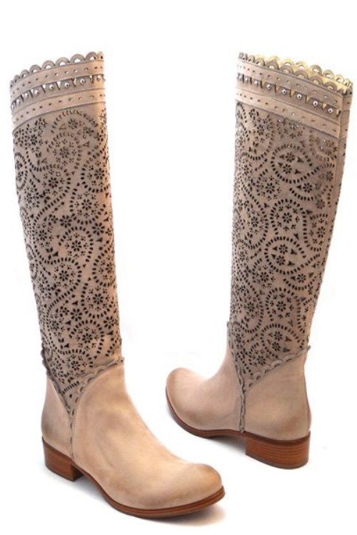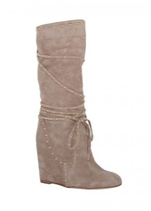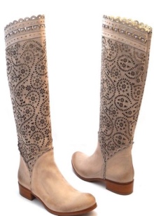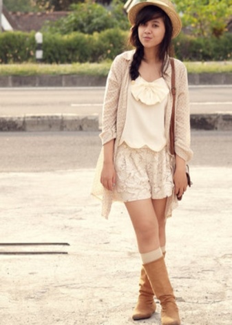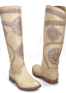 Boots of light beige shades can be used as an accent on the background of dark color clothing. They can be worn with things chocolate or burgundy. Boots delicate shade will be a bright accent stylish bow.