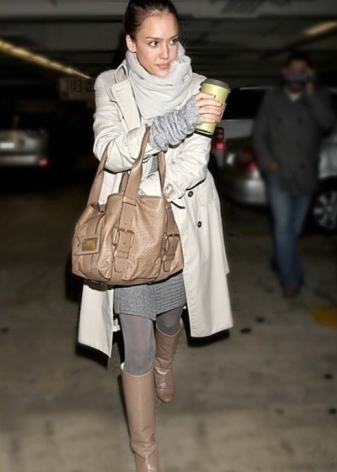 Outerwear should pick up light colors. But even if you want to wear beige boots in a tandem with a coat of dark color, then a scarf matched to the tone of the shoes is ideal for the embodiment of harmoniously bow.