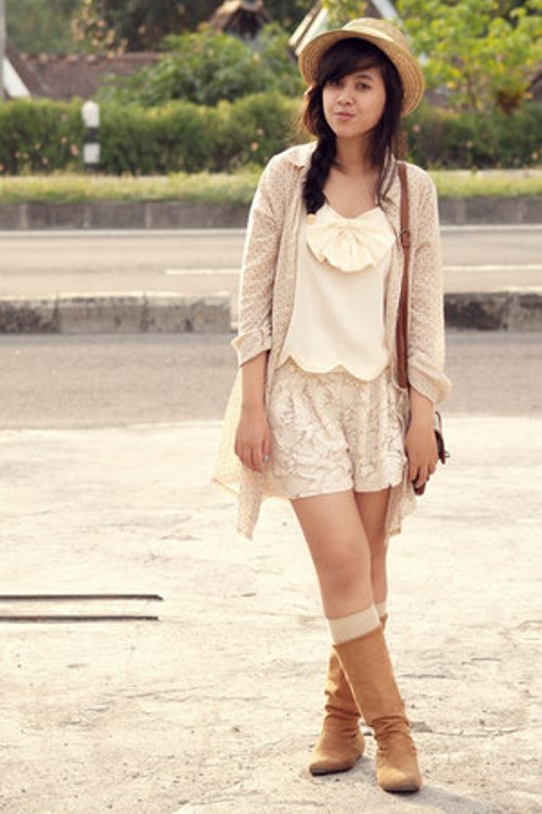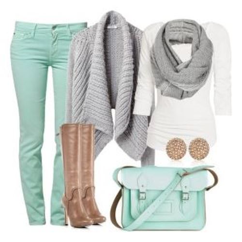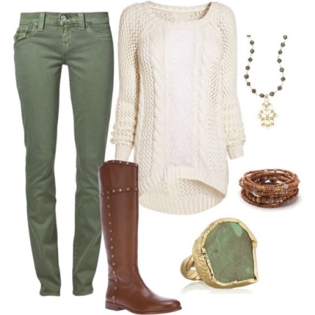 Beige boots can be worn with clothes of pale green or olive color. Many women of fashion prefer things the color of green mint. Brave girls choose clothes with a rich green or emerald hue. Refresh unique bow scarf will help from light fabric in pastel colors.