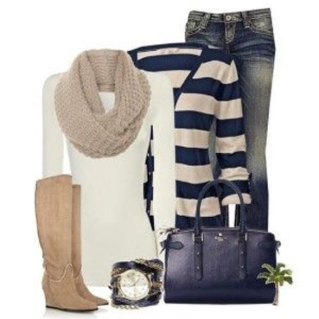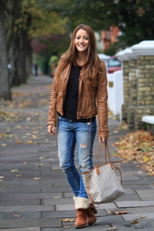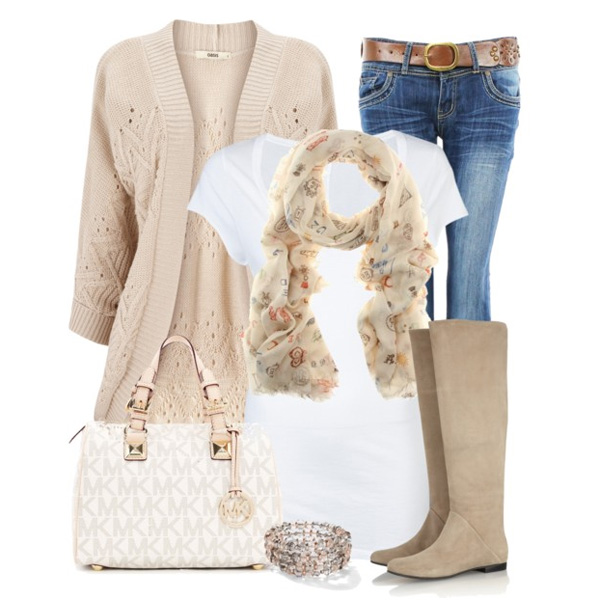 In the ensemble with jeans and beige boots you can wear a leather jacket to match the shoes. Stylish and spectacular.