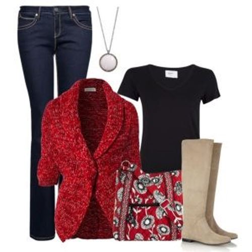 The main thing - to choose the right shades of red. With red clothes, boots of a grayish-beige shade look beautiful and harmonious.