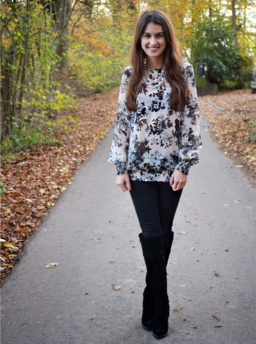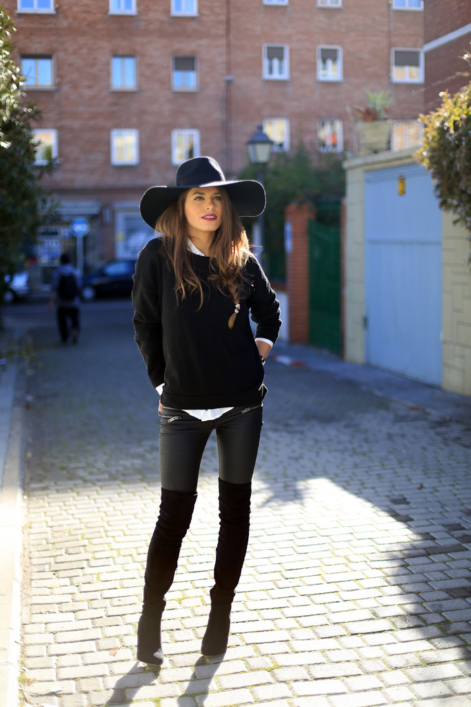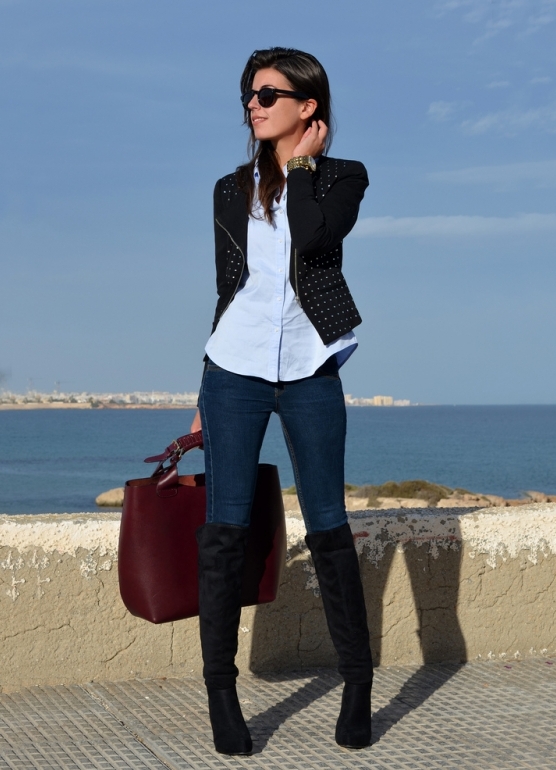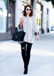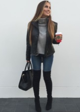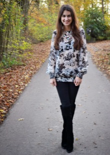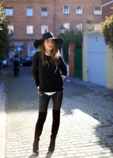Black suede boots "love" trousers and jeans that are easy to tuck into shoes. Cardigans, cozy sweaters, loose shirts will be appropriate. They should not be too bright, but a few noticeable details can be added –sharf, brooch, neckerchief.