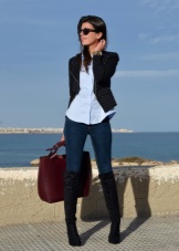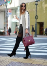 To go to work boots-boots look like a little. Therefore, it is better to go to the office or business meeting in classic black suede boots. They are in perfect harmony with the business suit (not trouser), shirt, knee-length skirts. The main mistake of fashionistas when creating such an image is too dark top As a result, the figure looks “harder” and is no longer a question of a flying walk. Choose light shirts and don't be fond of costume jewelry.