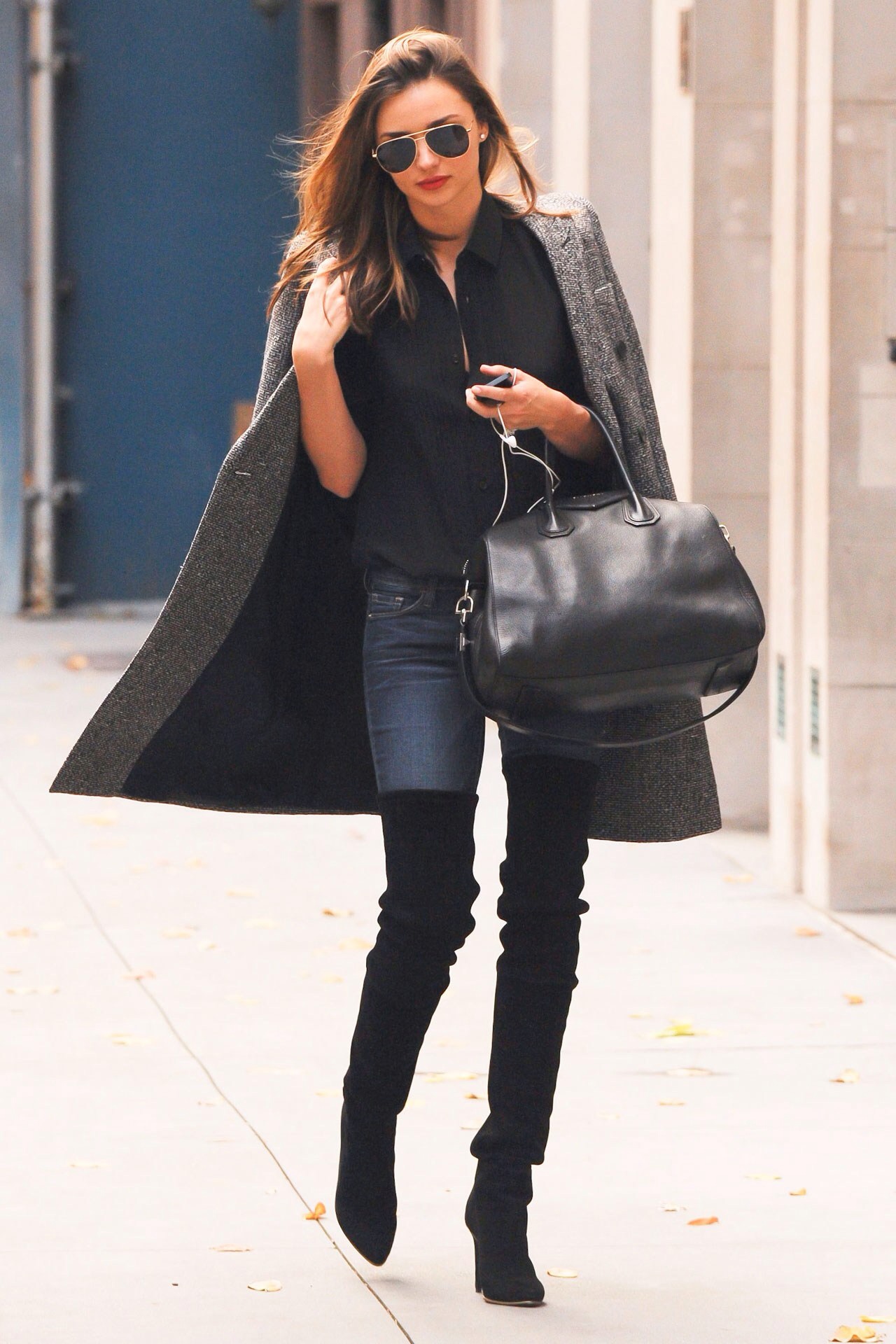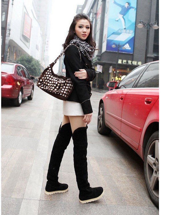 Almost any bag fits to black suede boots - big with a wide belt, small, and even a clutch.