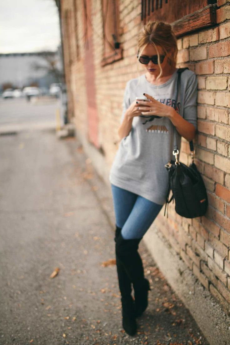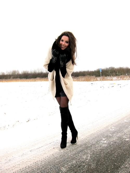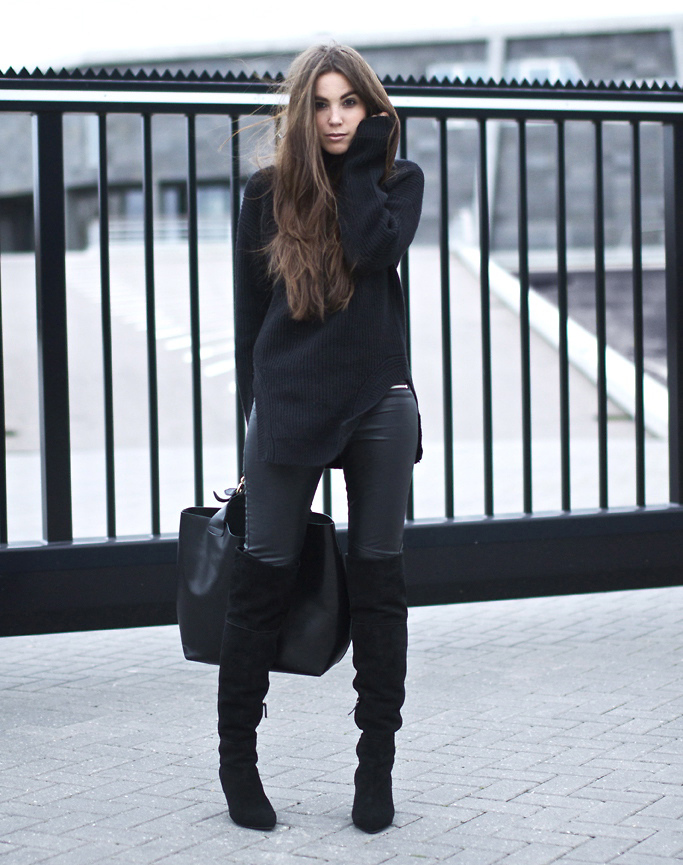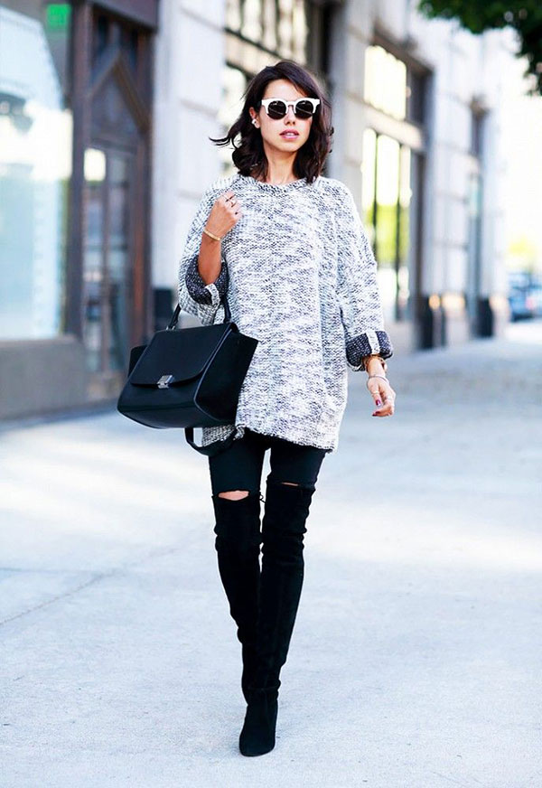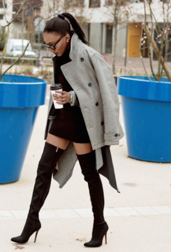 Black suede boots are perfect for creating a romantic look. Warm wool sweater dress and velvety suede are a great duet.