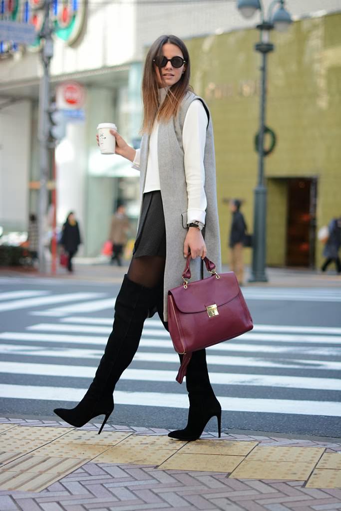 But skirts of leather and velvet set aside until better times. With suede high boots, they look immodest and even vulgar. But the vests of all stripes, on the contrary, neutralize the killer action of “suede beauty” - in the boots and the waistcoat, the girl looks a little home-like. It is touching and gentle.