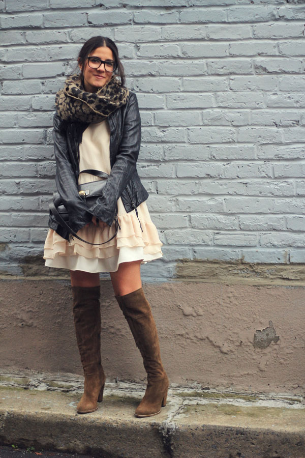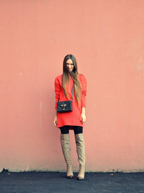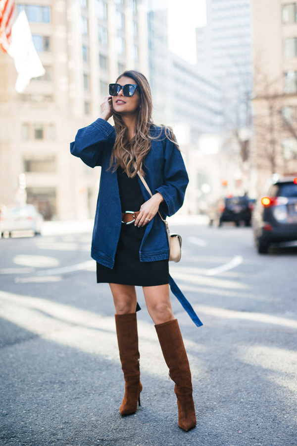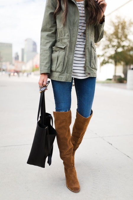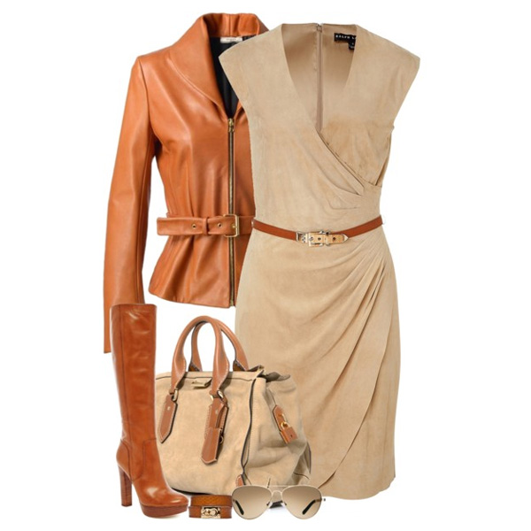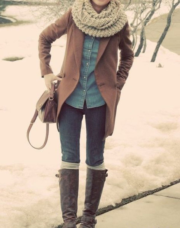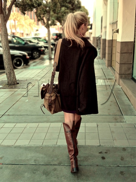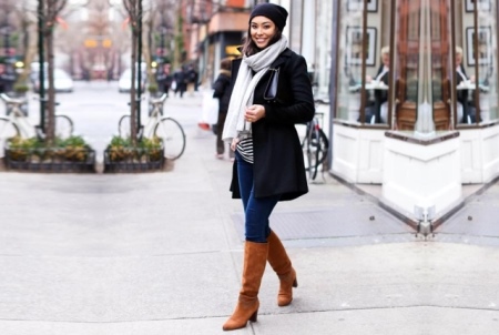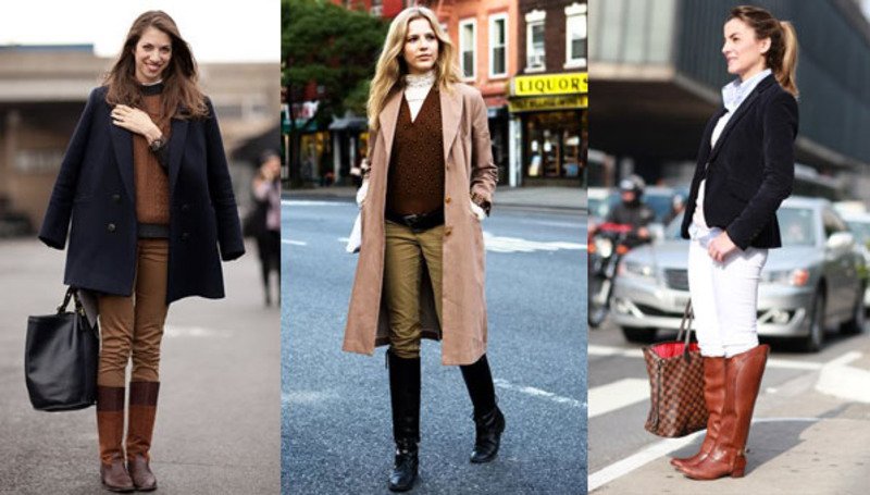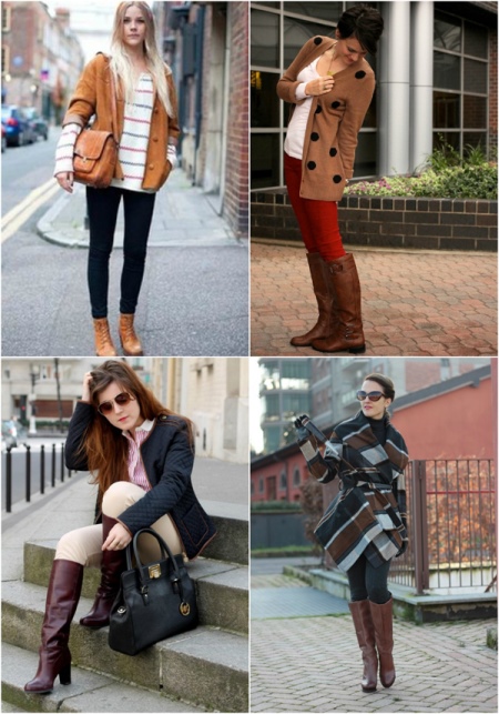- The color of any type of outerwear (jacket, cardigan, sweater, fur coat, down jacket, coat or sheepskin coat) must overlap or match the color of brown boots;