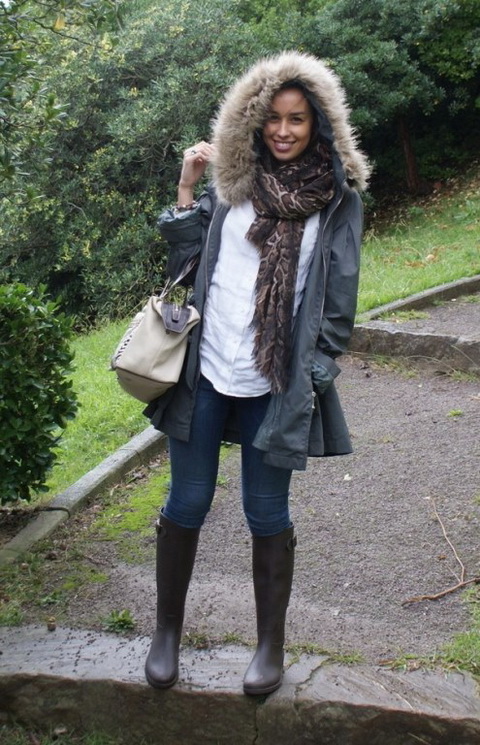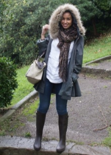 By the way, rubber boots are a little loose from the legs, and you can wear them with your favorite tight jeans or tight tights, warm leggings. Also rubber boots go well with knit dresses or long skirts. Outerwear is suitable here, for example, a down jacket, leather jacket, trench coat, sports bomber jacket or park.