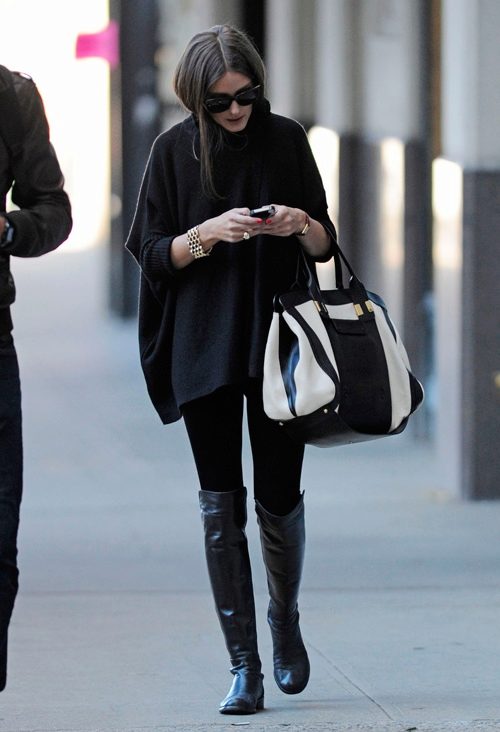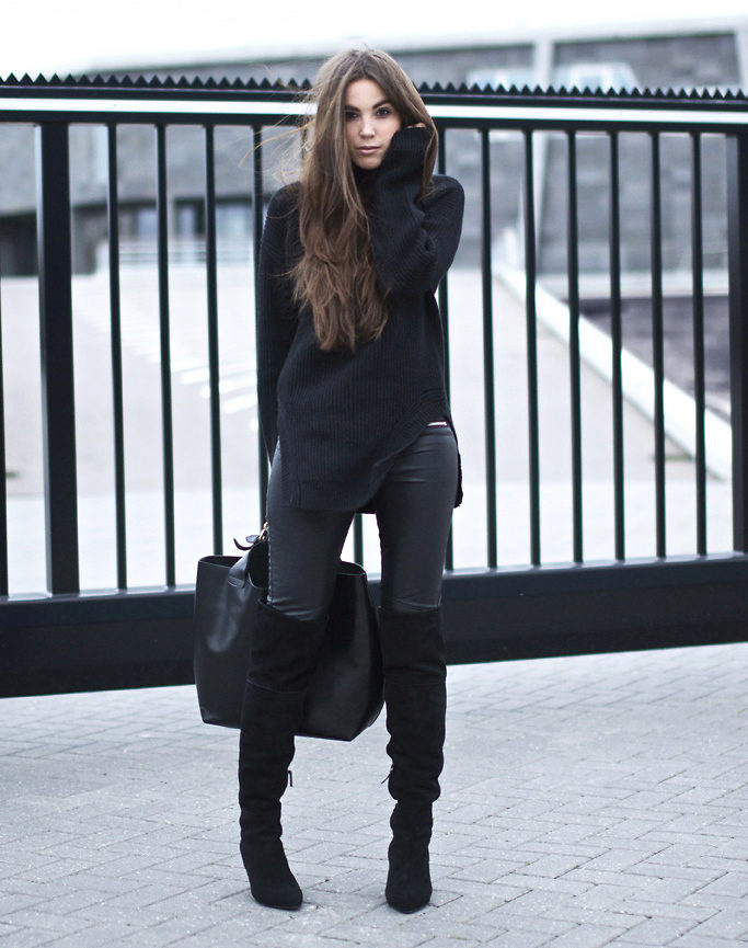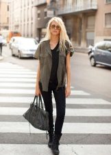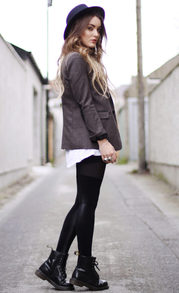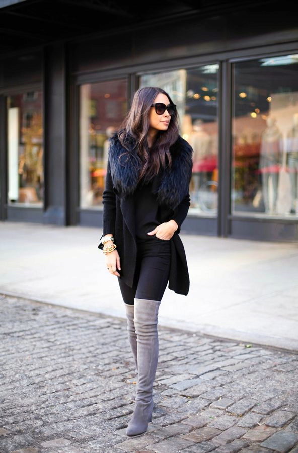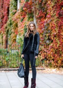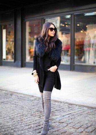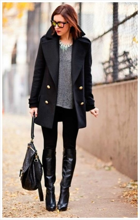 This look is suitable for work or for everyday wear, it is both concise and stylish. Black leggings, a gray jumper, a cropped black coat, and black leather boots. Complement the image of a roomy bag and sunglasses. The decoration is an unusual necklace that attracts attention.