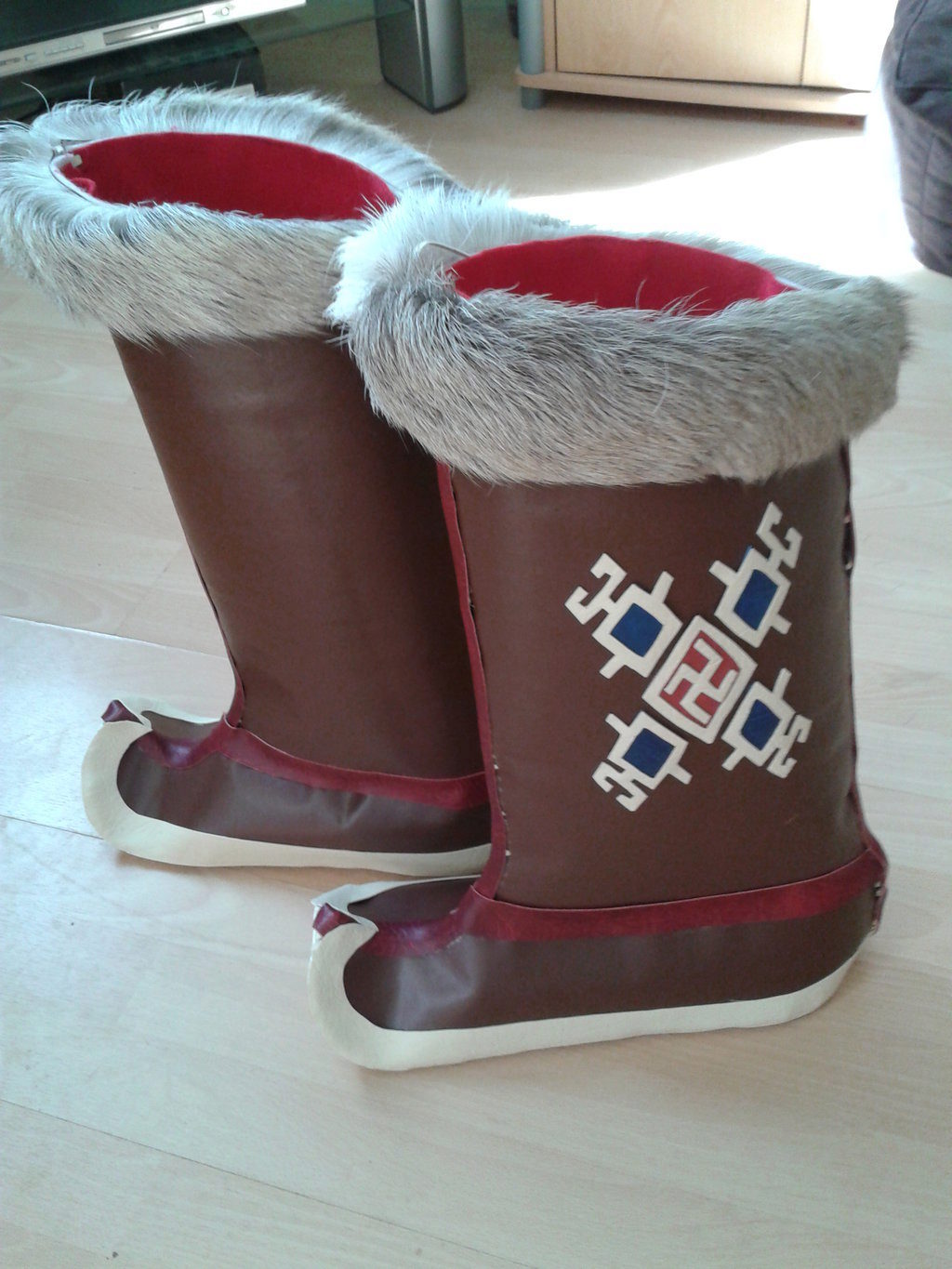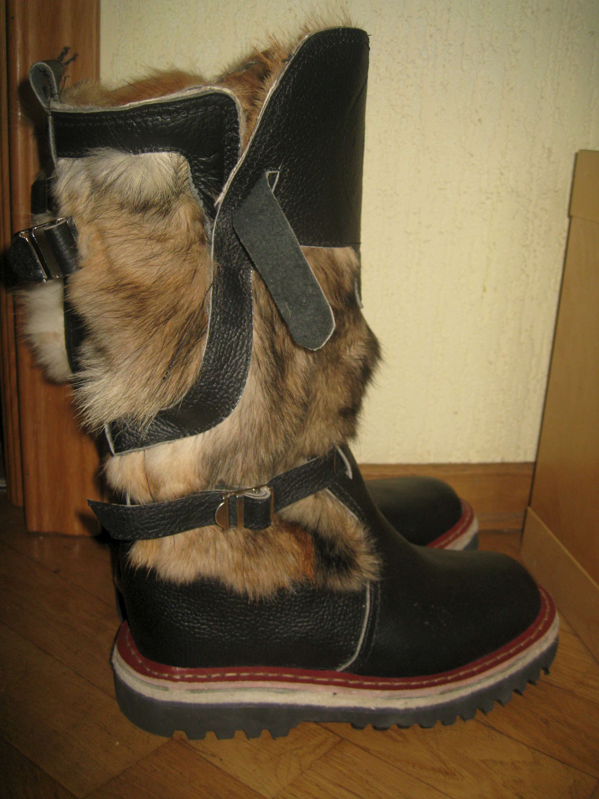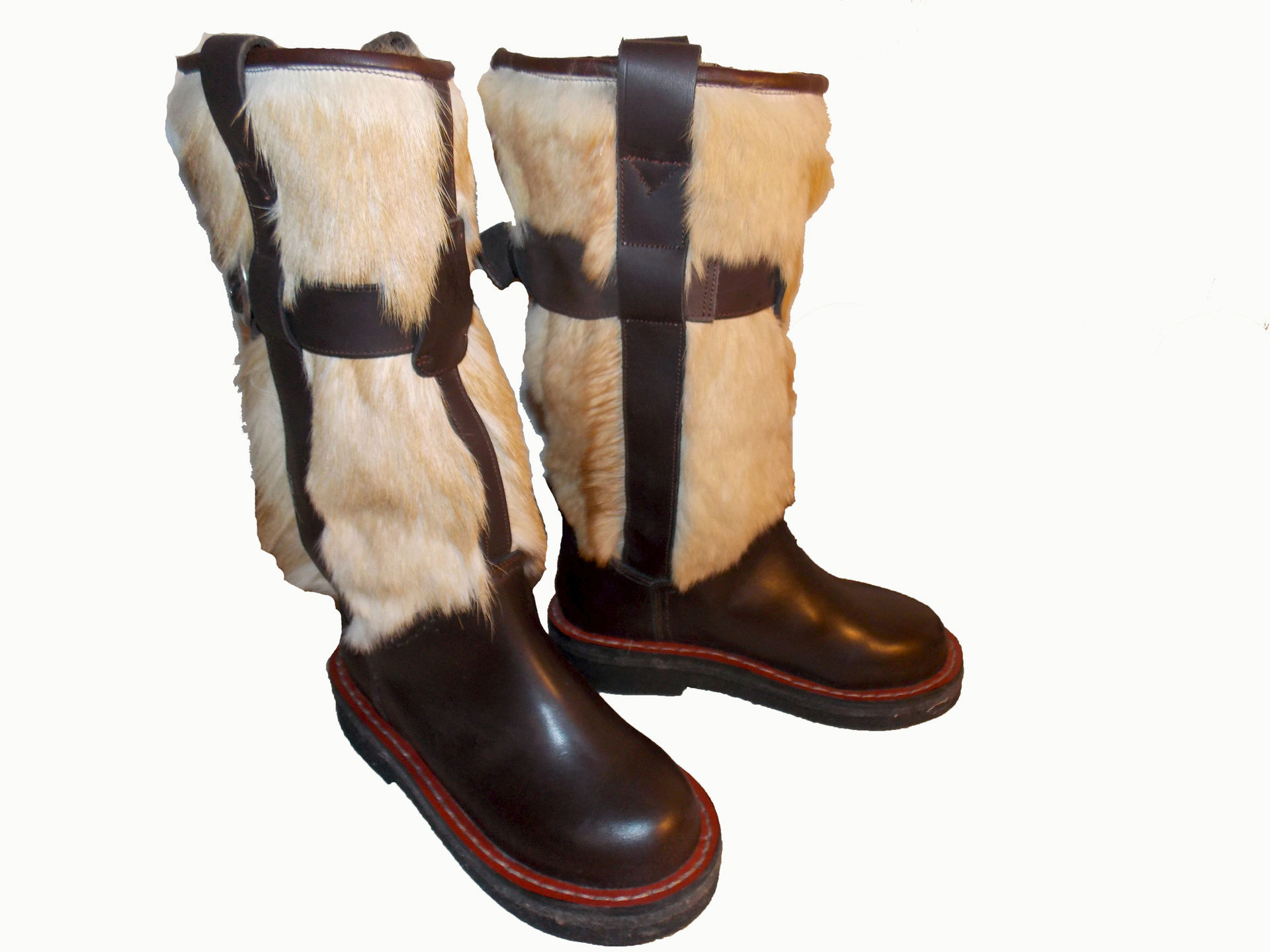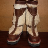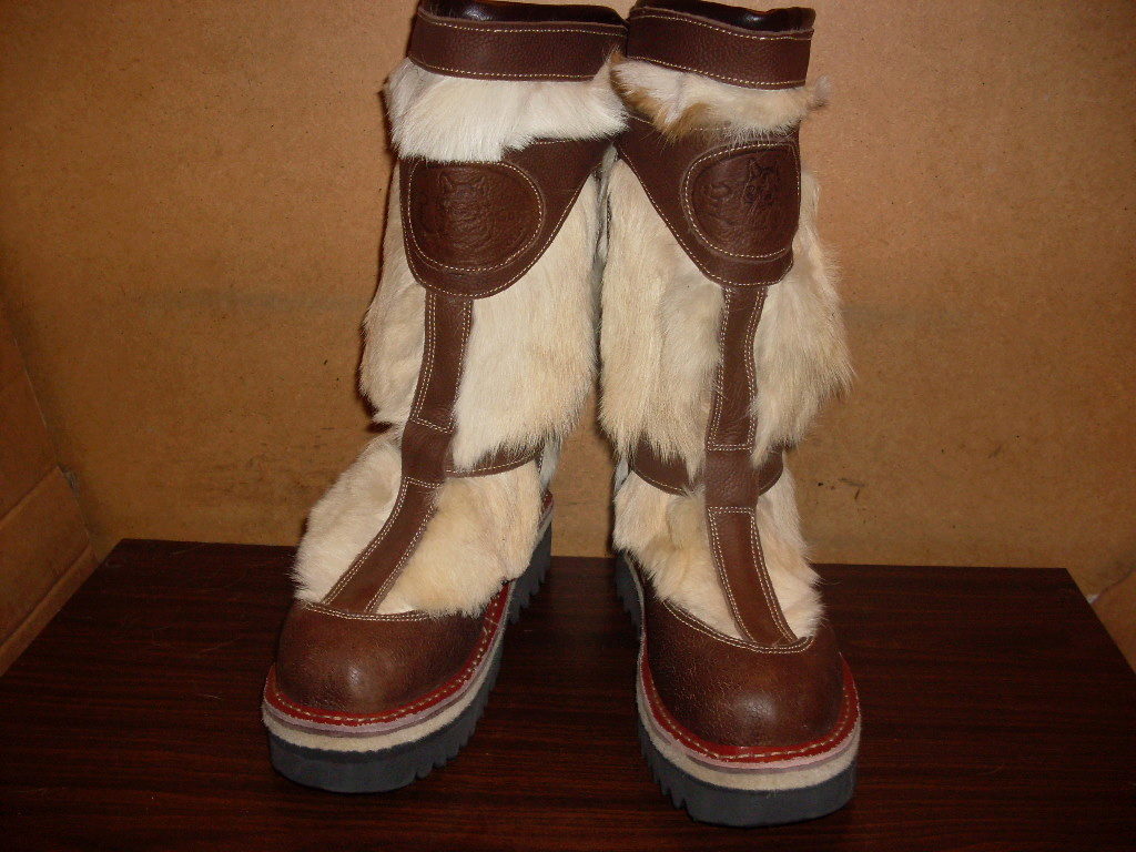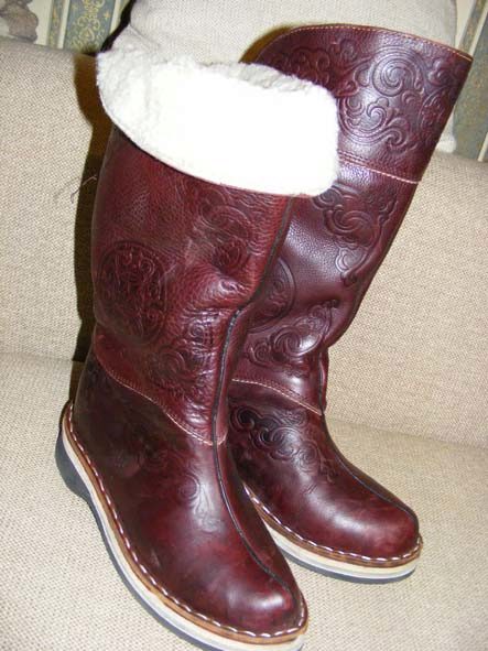 Fashionable women’s shoes are a variation on Mongolian boots with their wide fur trim.