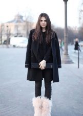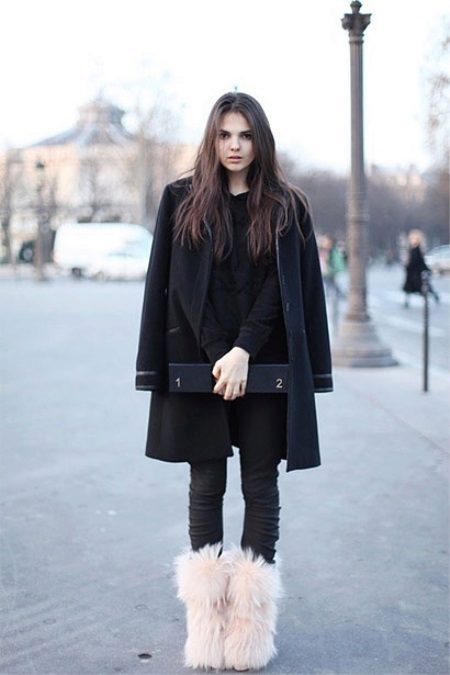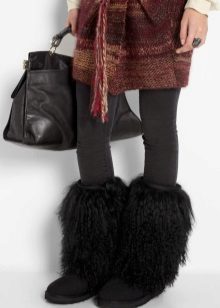 Mongolian boots are well combined with turtlenecks, tight-fitting pullovers, but also spacious sweaters with some kind of decor.